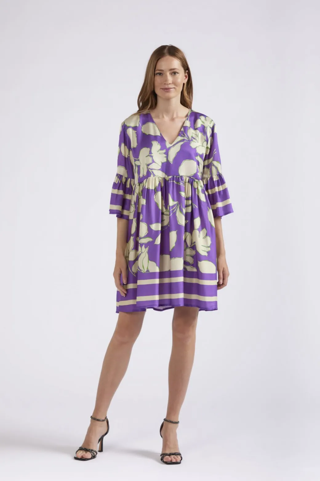 Abito dalla vestibilità comoda con arricciatura in vita e maniche ampie. realizzato in tessuto di viscosa stampata.