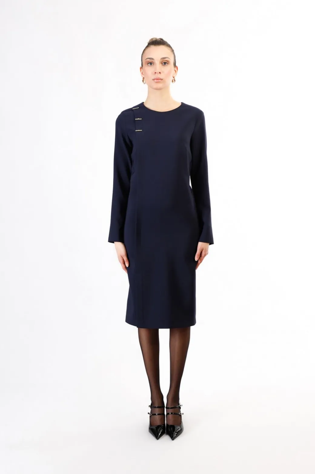 Abito girocollo modello tubino e motivo di finto portafoglio con dettaglio personalizzato a rifinitura. il capo è a maniche lunghe e realizzato in tessuto bistretch. chiusura posteriore tramite zip a scomparsa. abito semplice e versatile perfetto per l’ufficio femminile e nello stesso tempo pratico da tenere sempre nel tuo guardaroba.