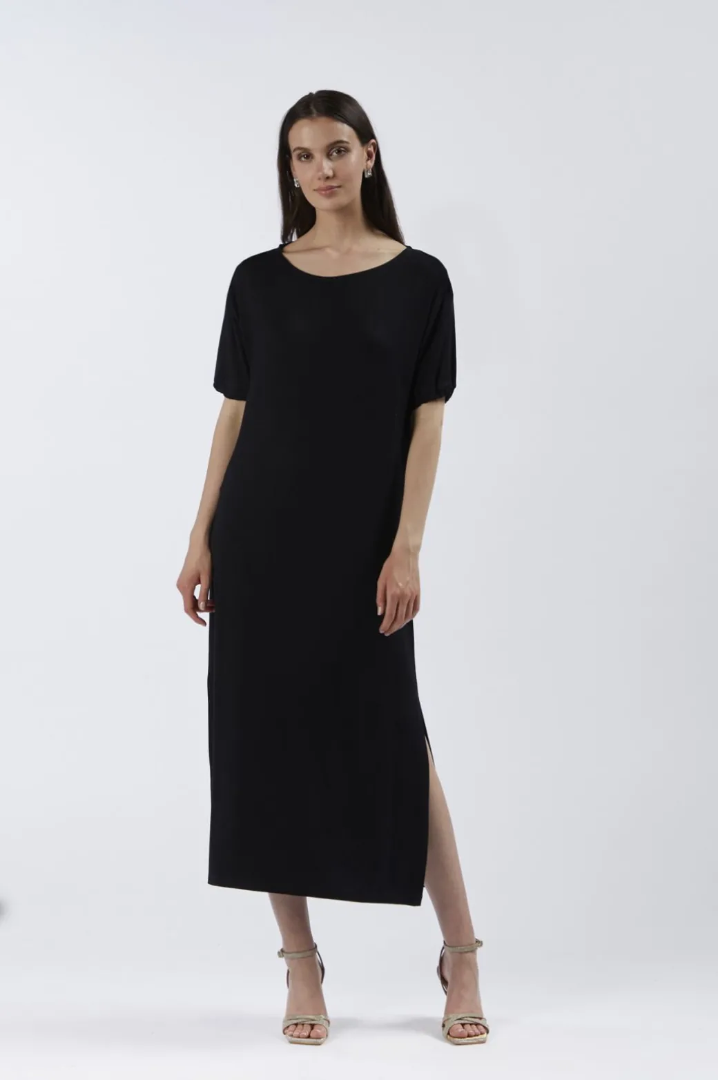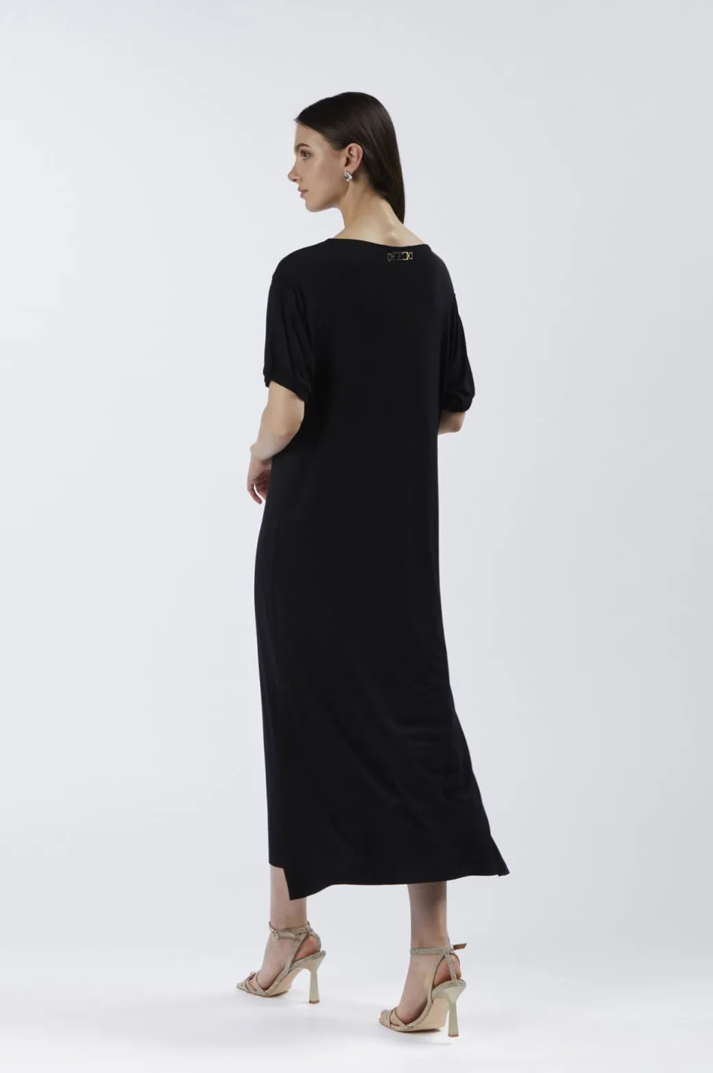Abito lungo con spacchi laterali e placchetta dorata logata alle spalle. abito realizzato in jersey di viscosa. maniche corte a palloncino.
