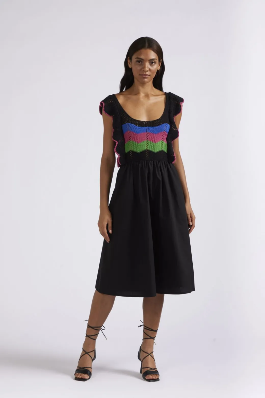 Abito smanicato lunghezza al ginocchio. il top è smacchinato con un filato misto cotone lavorazione crochet multicolor. la gonna è realizzata in popeline di cotone.