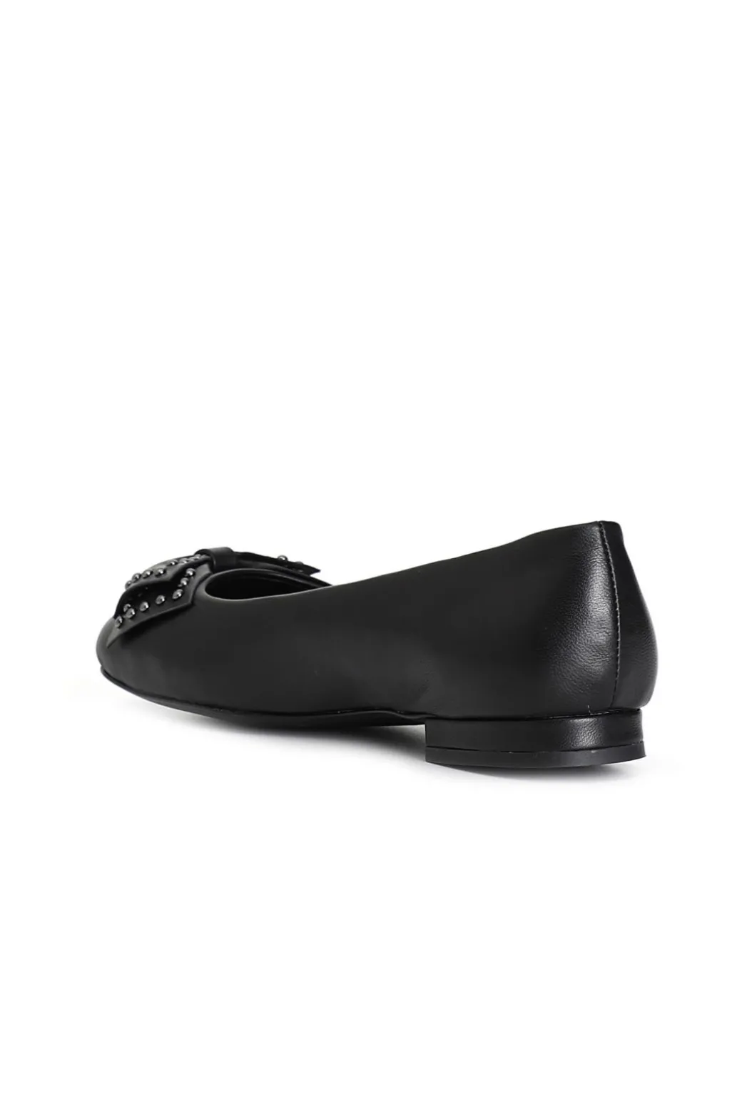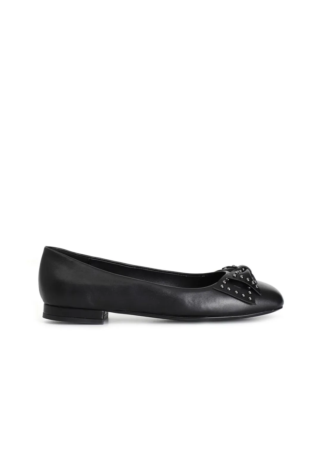Ballerina in pelle con fiocco e borchie. tacco rivestito alto 15 mm. la fodera e soletto sono in pelle.