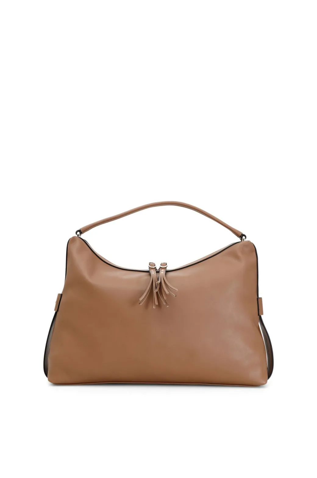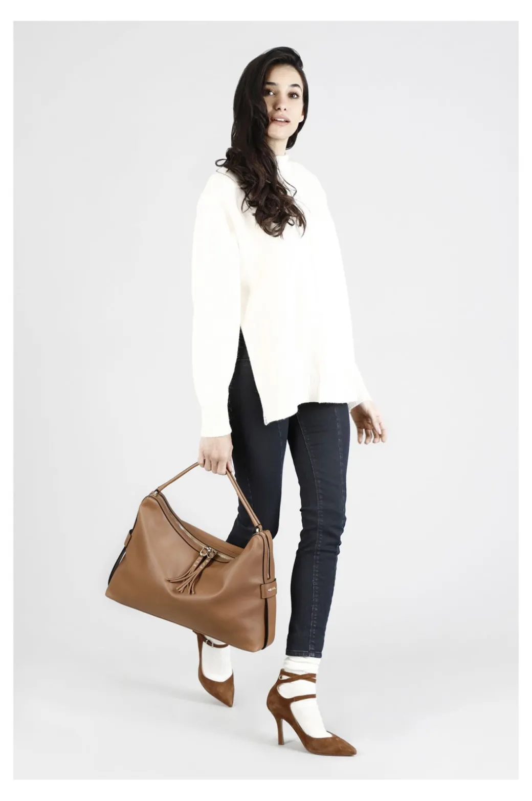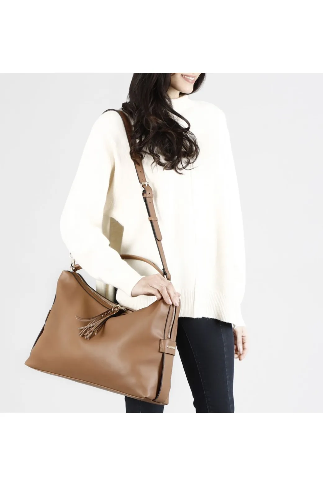 Bauletto con maxi cerniera e nappine sfrangiate. Tracolla in dotazione