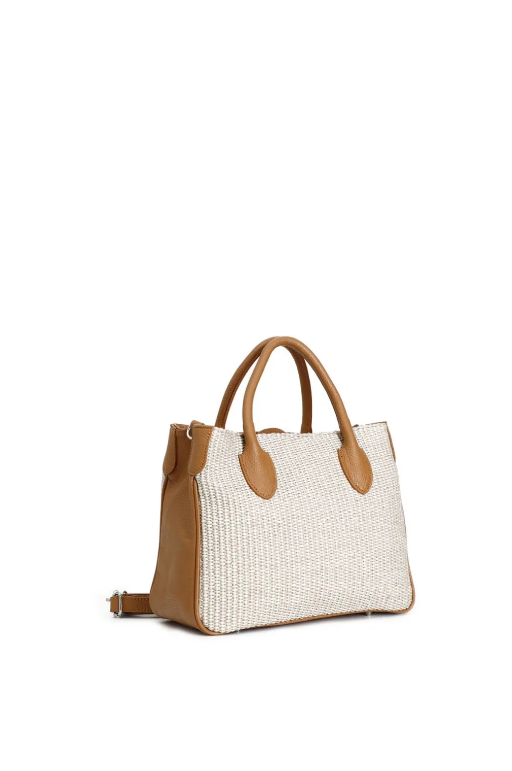 Bauletto in rafia chiuso con pattina con rifiniture in pelle. ciondolo quadrato in metallo con logo. manici tubolari e tracolla.