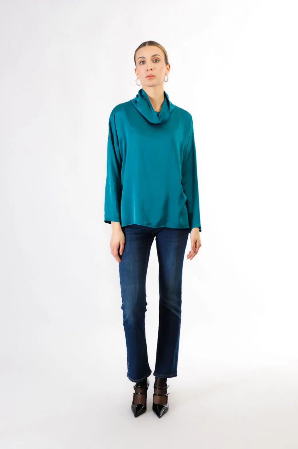 Blusa over size in raso di viscosa articolo tinto in capo. linea a scatolina con colletto alto e maniche lunghe. dalla vestibilità morbida è una proposta contraddistinta da eleganza e funzionalità adatta a molteplici combinazioni e occasioni.