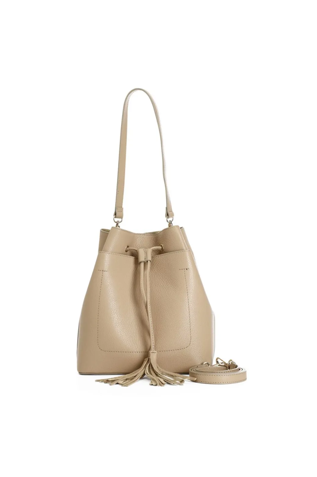 Borsa a secchiello in pelle martellata con tasca sul davanti chiuso con coulisse con nappine in pelle. borsa dotata di tracolla.