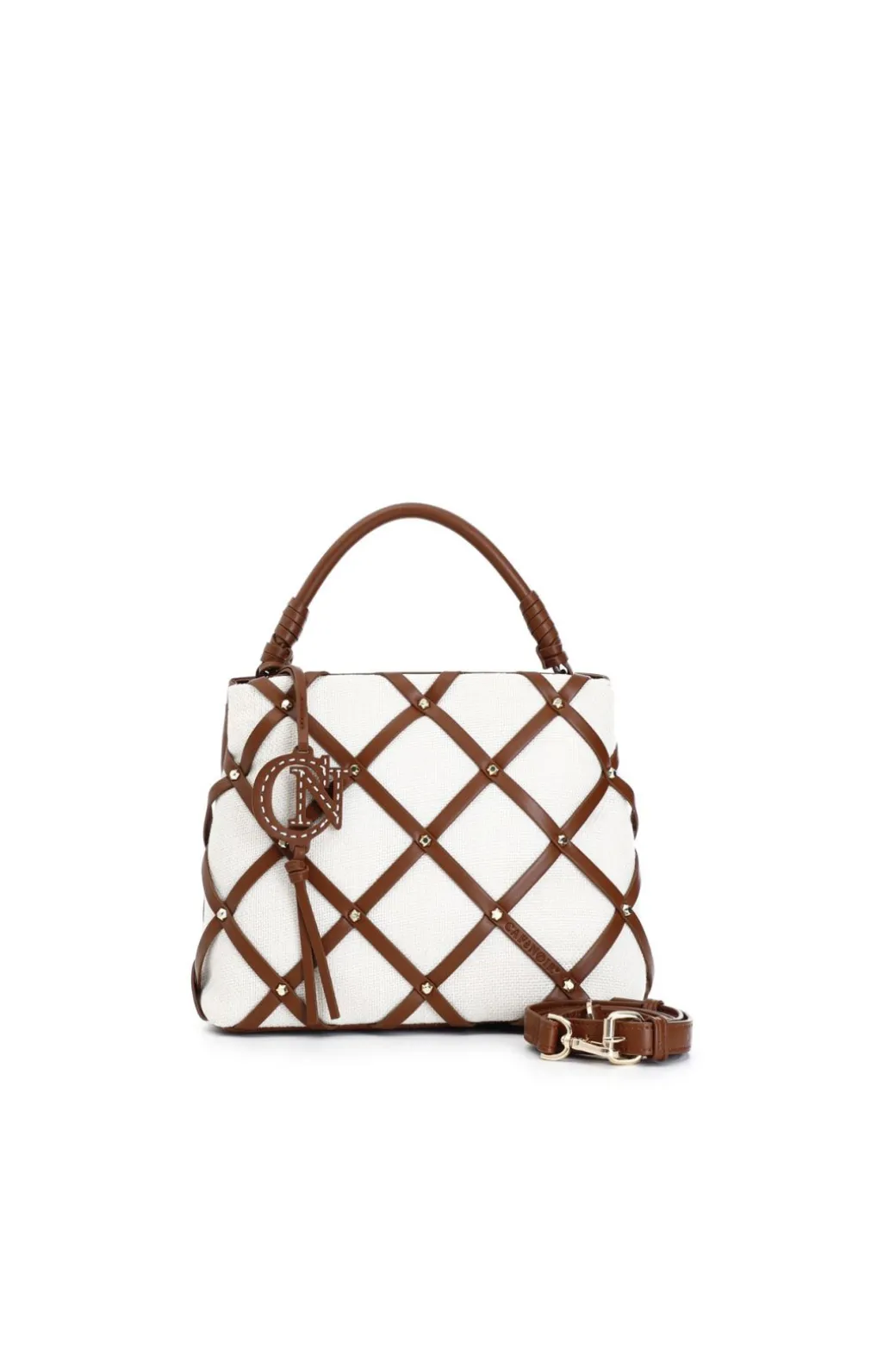 Borsa a secchiello in tessuto con intreccio effetto rete e applicazioni di borchiette dorate. charm con logo effetto cuoio. chiusura con cerniera. borsa dotata di tracolla.