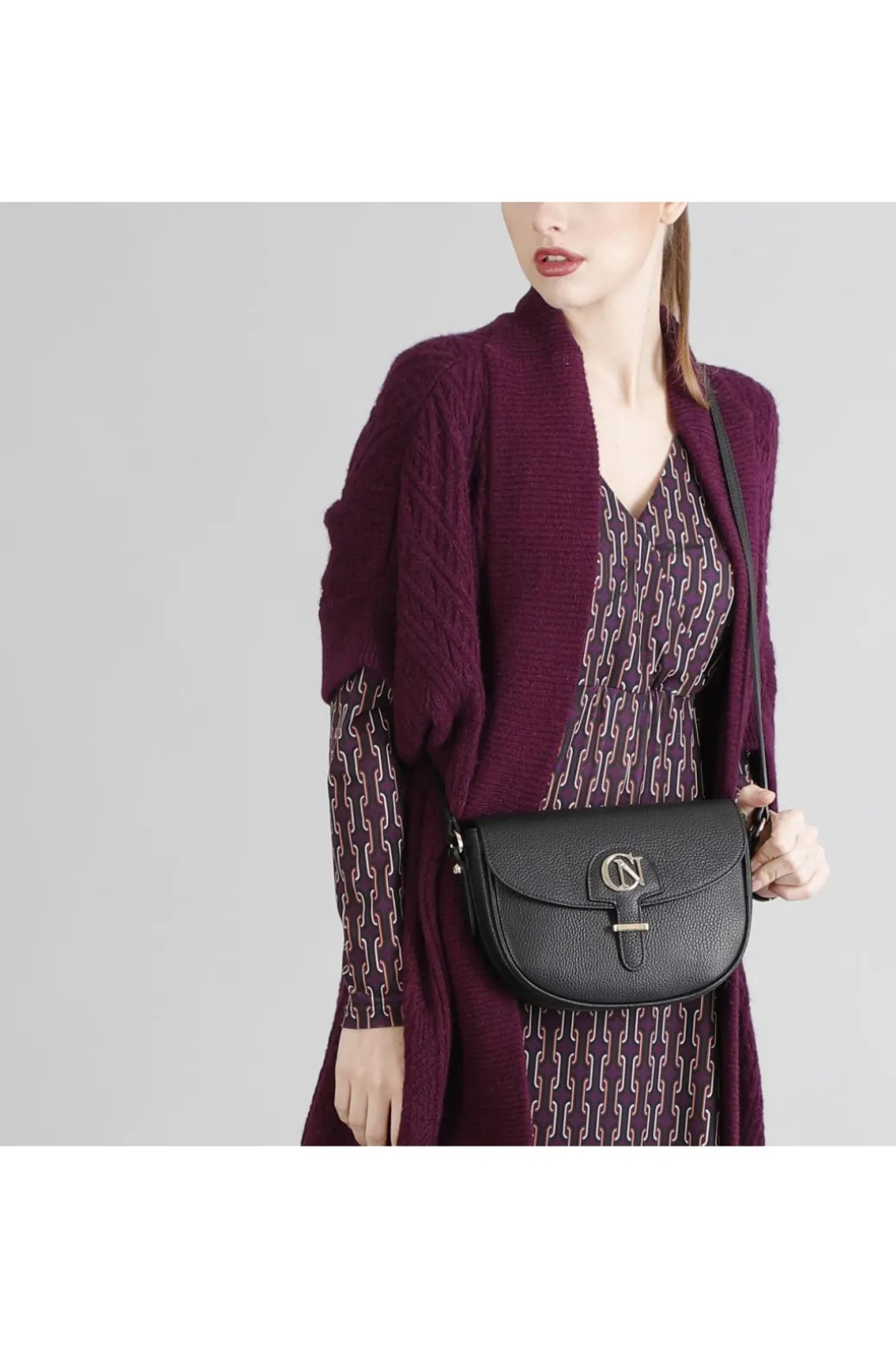 Borsain pelle con pattina e logo cafènoir. chiusura con calamita e tracolla regolabile.