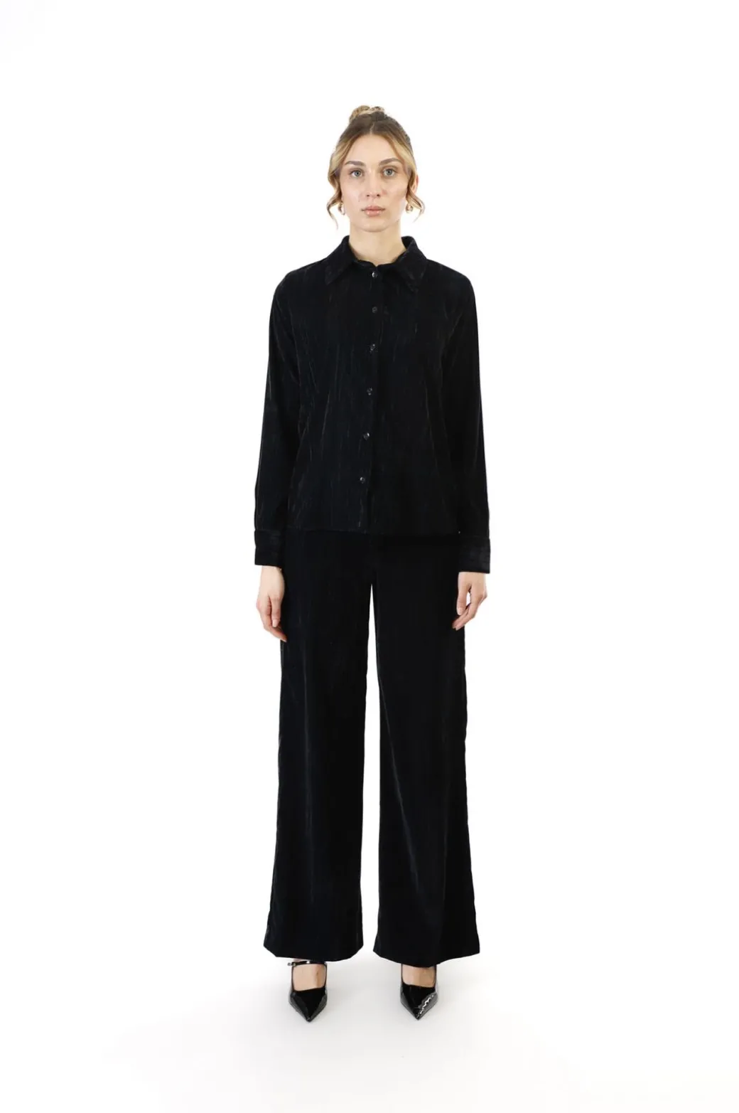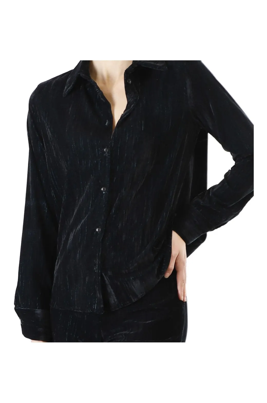 Camicia elegante a maniche lunghe. realizzata in velluto operato dall’effetto cangiante. chiusura con bottoni. vestibilità morbida da abbinare a pantaloni fluidi o jeans.