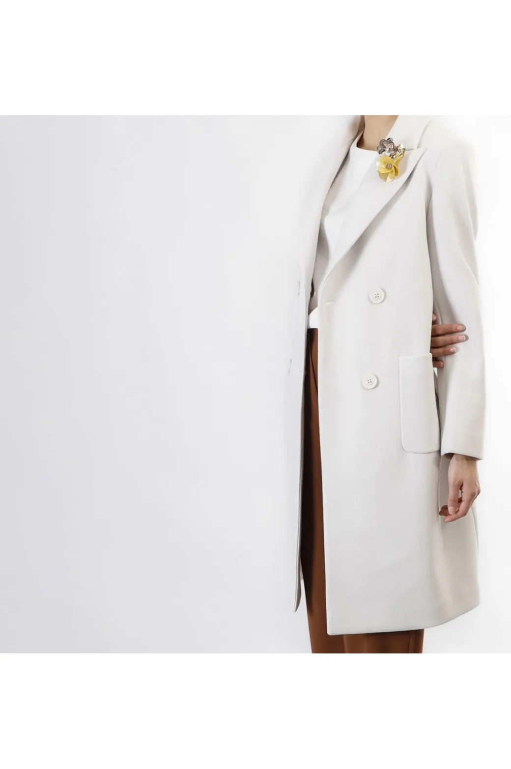 Intramontabile cappotto basico doppiopetto. il colletto è decorato da una spilla. perfetto per valorizzare in un attimo i look di tutti i giorni.