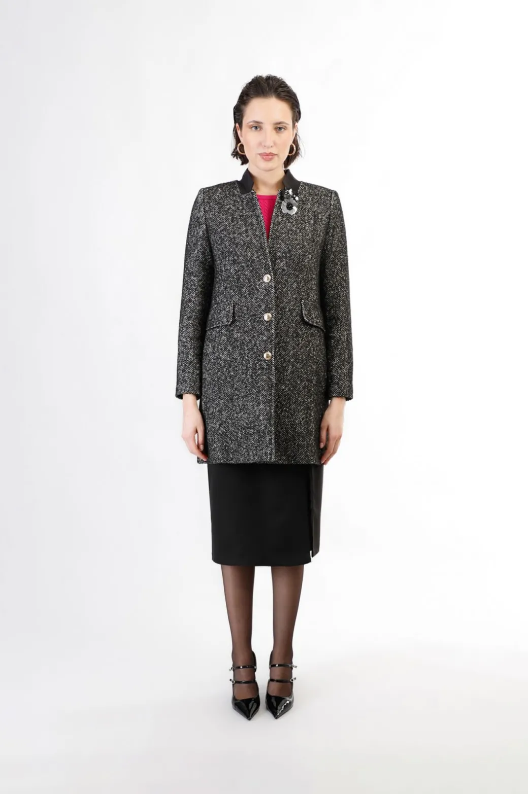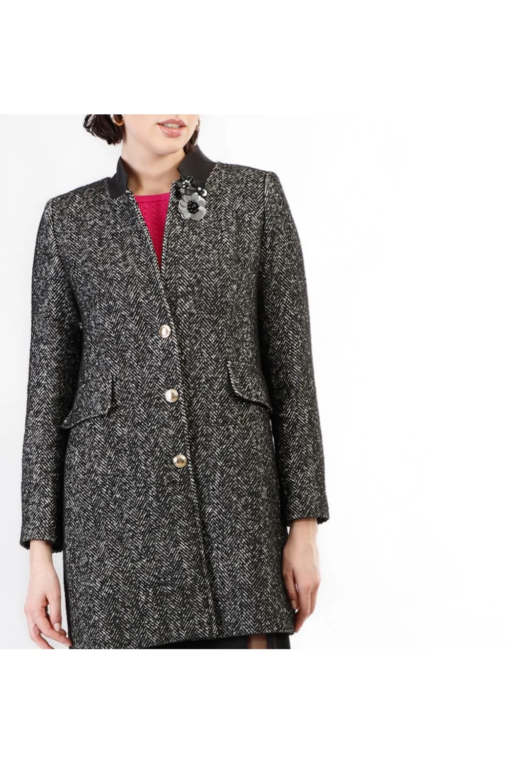Cappotto dritto monopetto in tessuto spigato. chiusura con bottoni. capo elegante e funzionale.