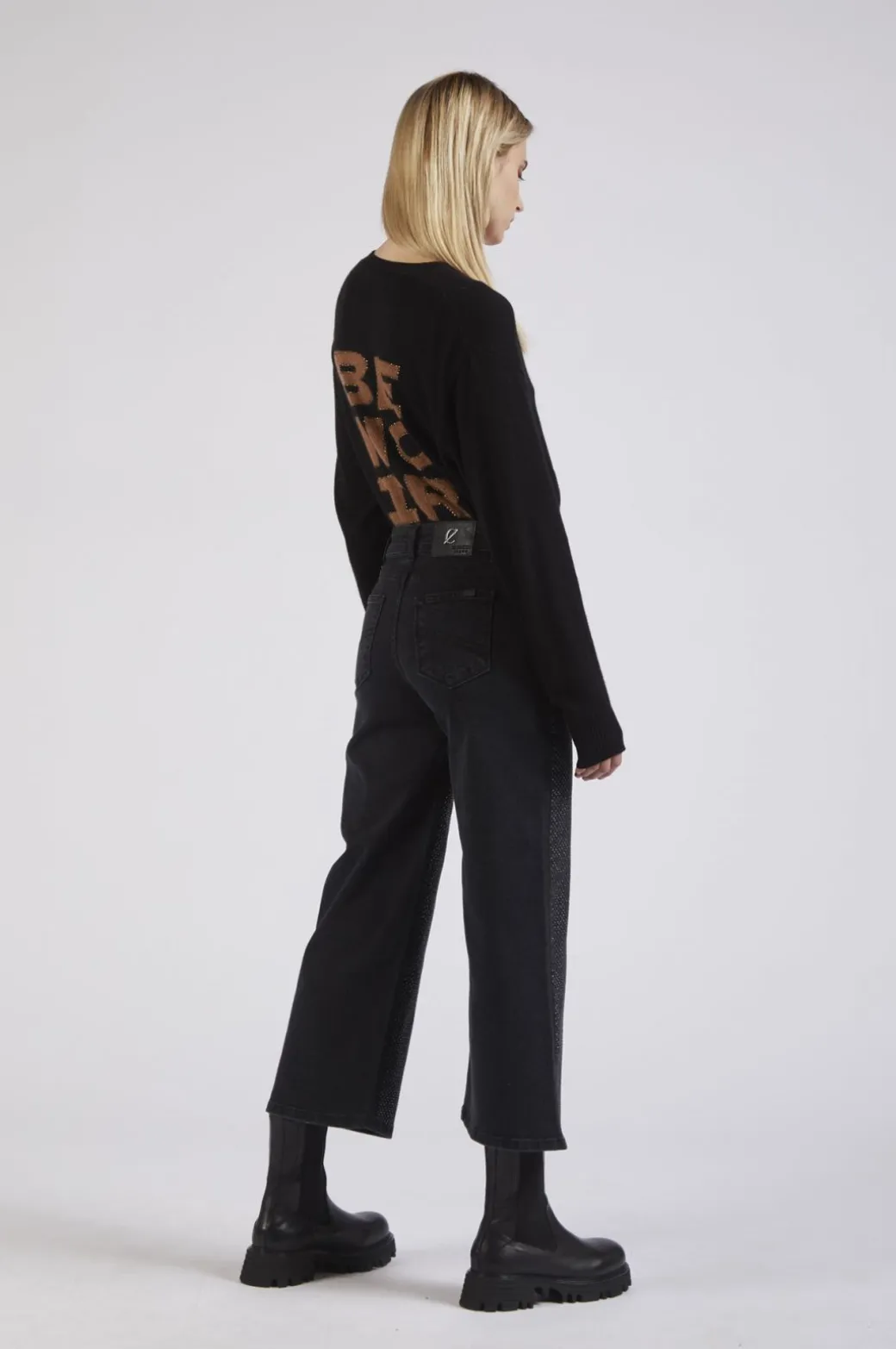 Jeans in tela denim super stretch dalla vestibilità culotte. motivo di strass termoadesivi su tutto il davanti del jeans.