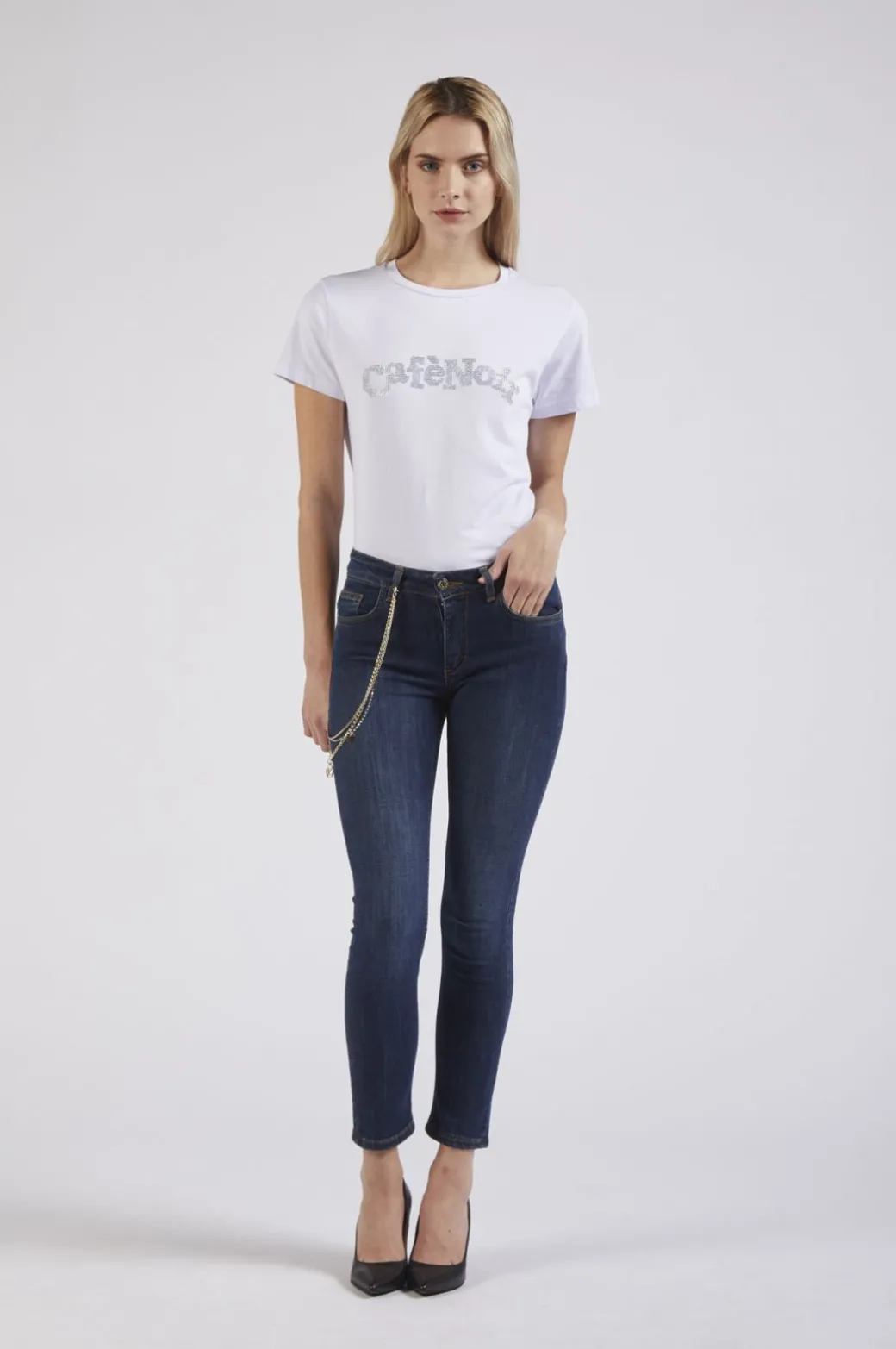 Jeans in tela denim super stretch dalla vestibilità skinny. arricchisce il capo una ricercata catena gioiello personalizzata.