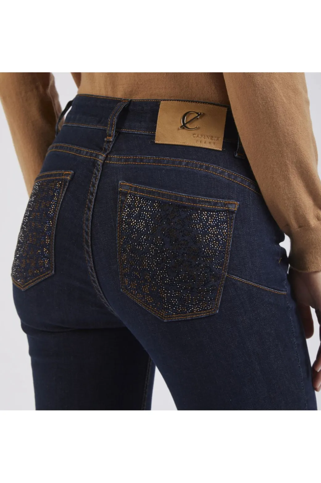 Jeans in tela denim super stretch dalla vestibilità skinny. applicazione di strass sulle tasche posteriori.