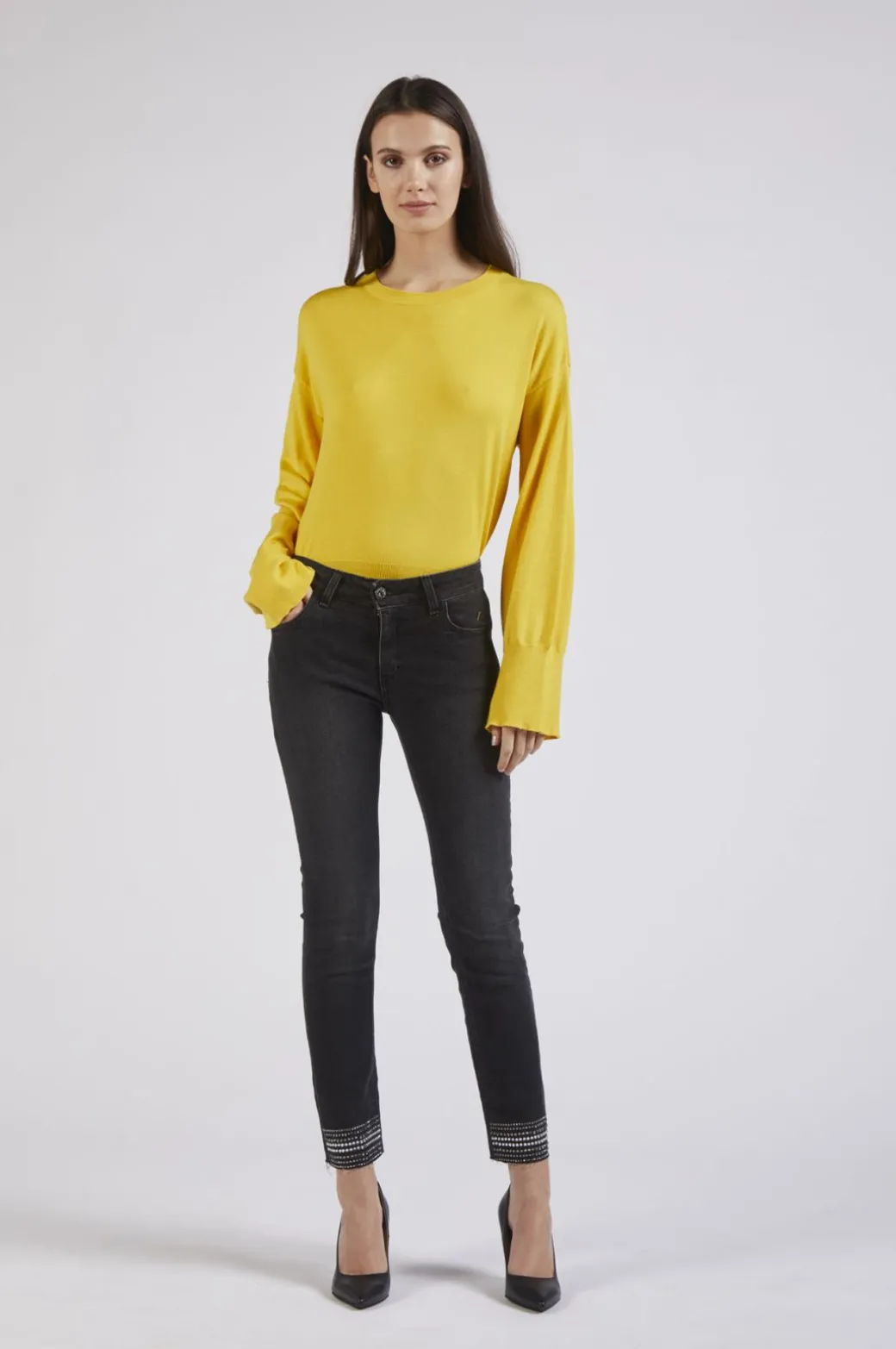 denim slim con stras al fondo grigio