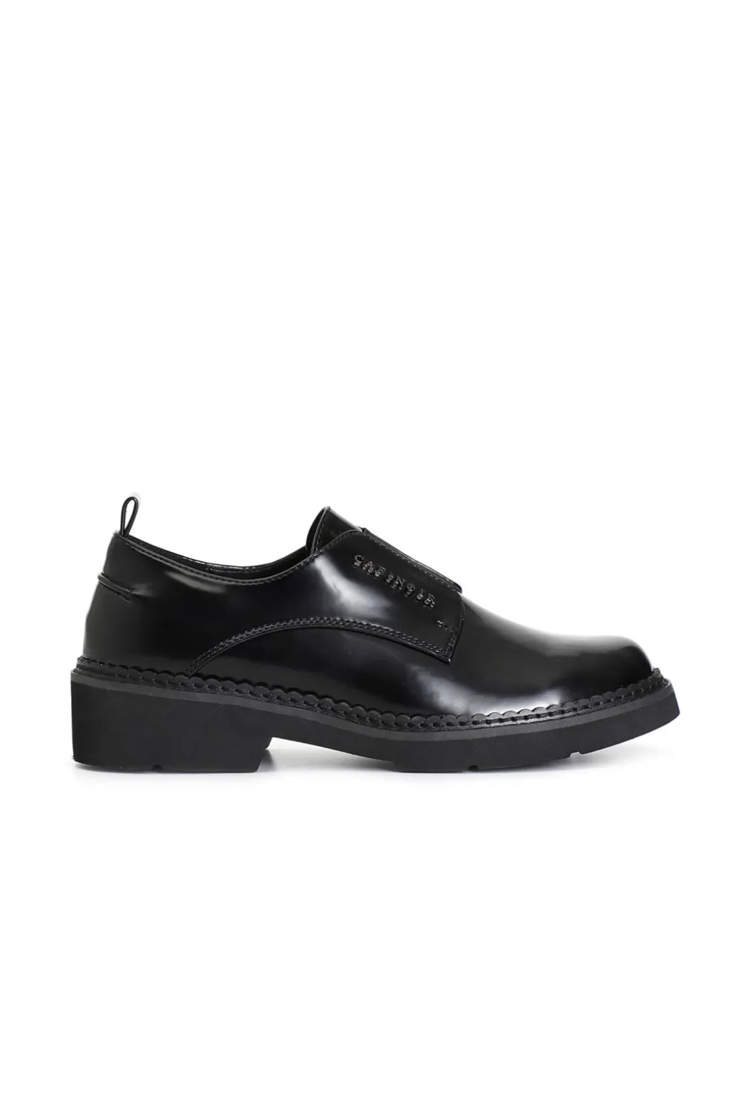 Derby da donna in similpelle abrasivato con elastico e accessorio lettering cafènoir. il soletto è in pelle.