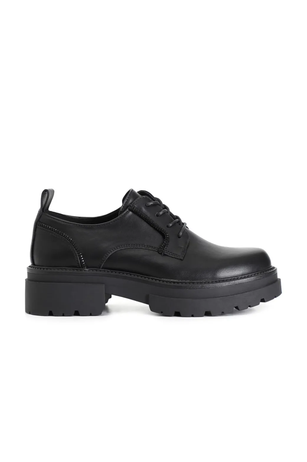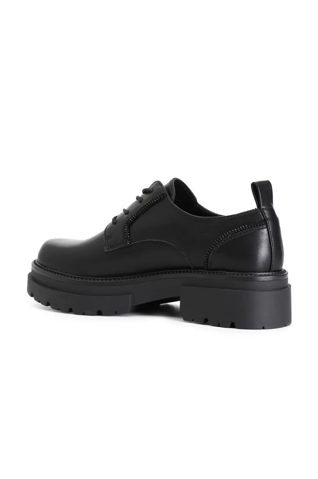 Scarpa derby da donna allacciata in similpelle spazzolata con profili in strass. il soletto è in pelle.