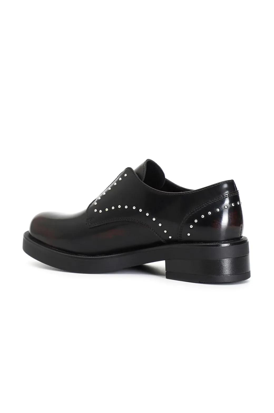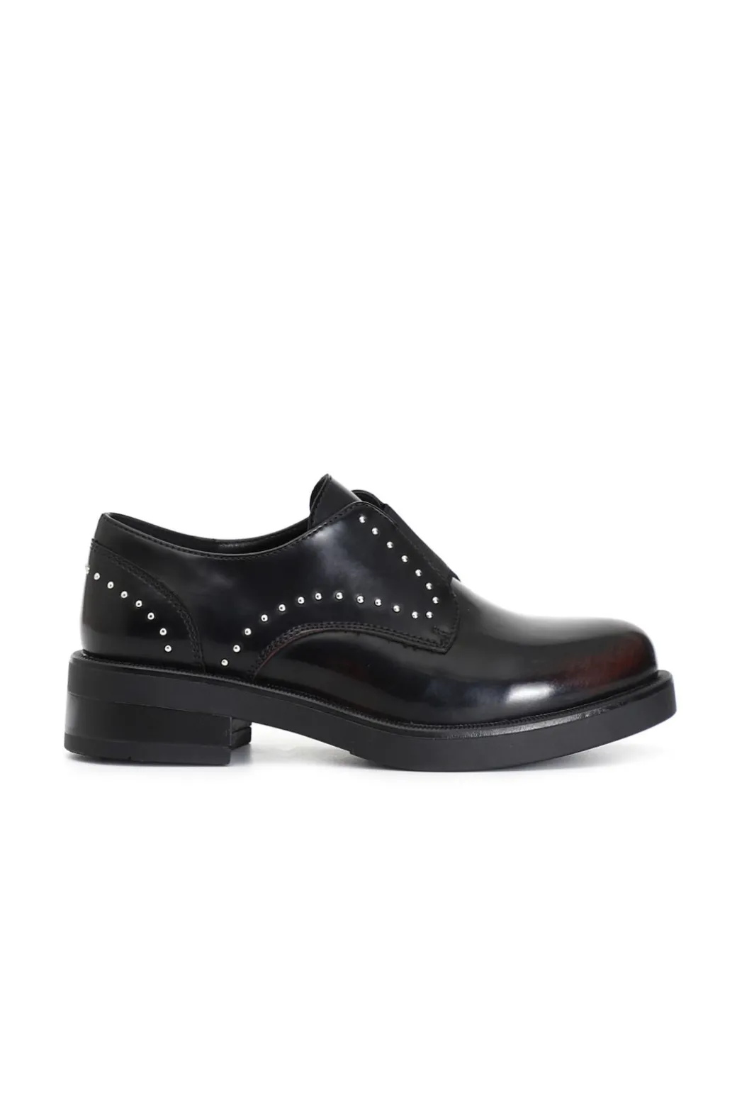 Scarpa derby da donna in similpelle spazzolata con elastico e con microborchie cromate. il soletto è in pelle.