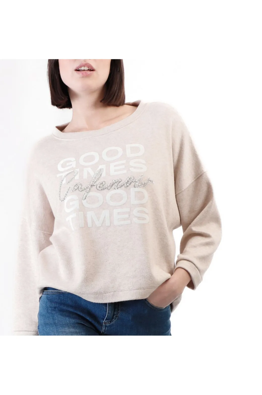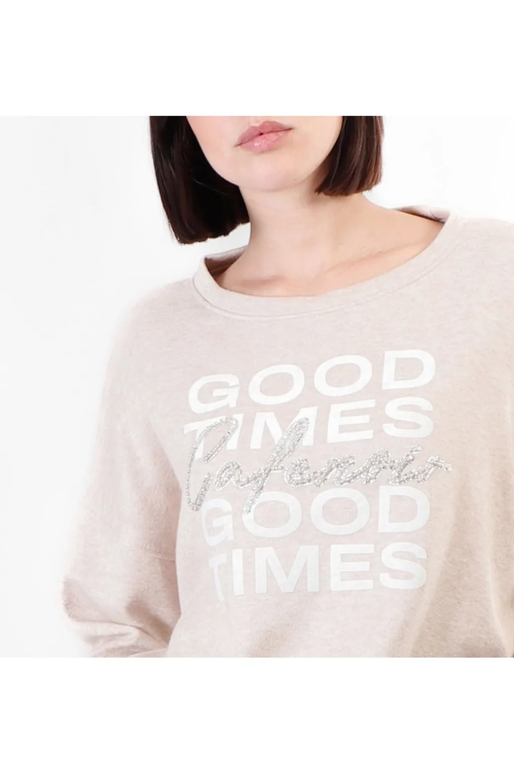 Felpa over dalla mano calda con scollo a barca e manica a pipistrello. stampa floccata e ricco ricamo a mano. capo estremamente comodo funzionale e di tendenza.