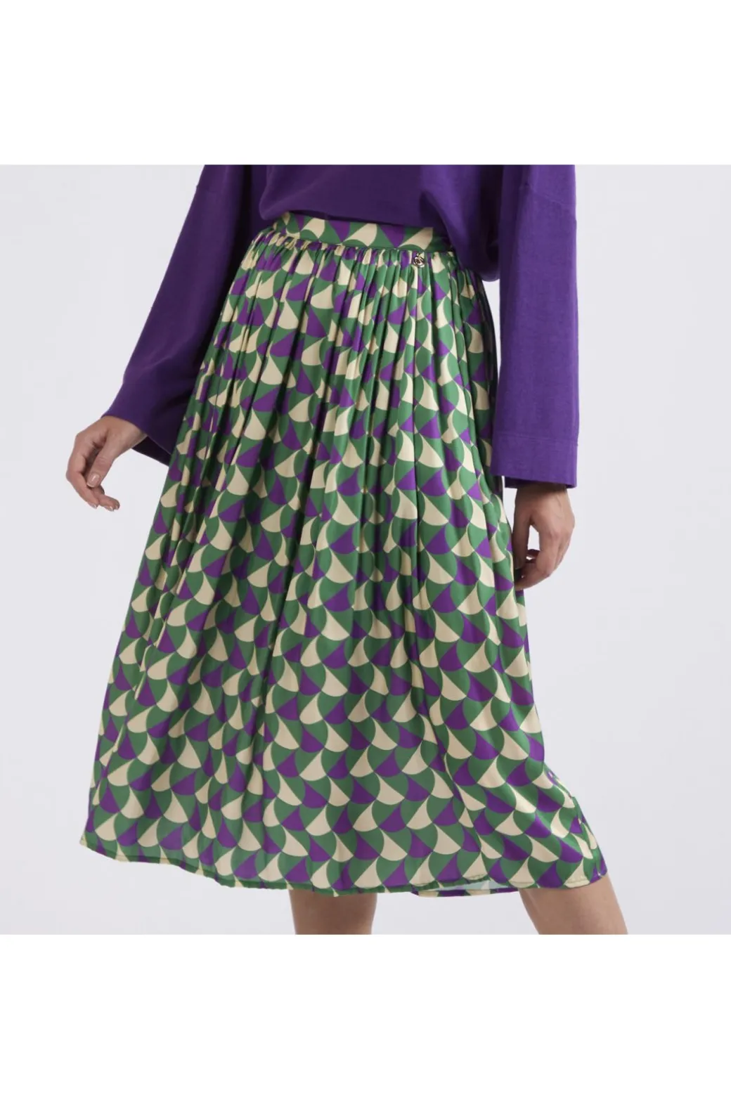 Gonna a ruota lunghezza al ginocchio realizzata in saglia di viscosa stampata. chiusura con zip laterale.