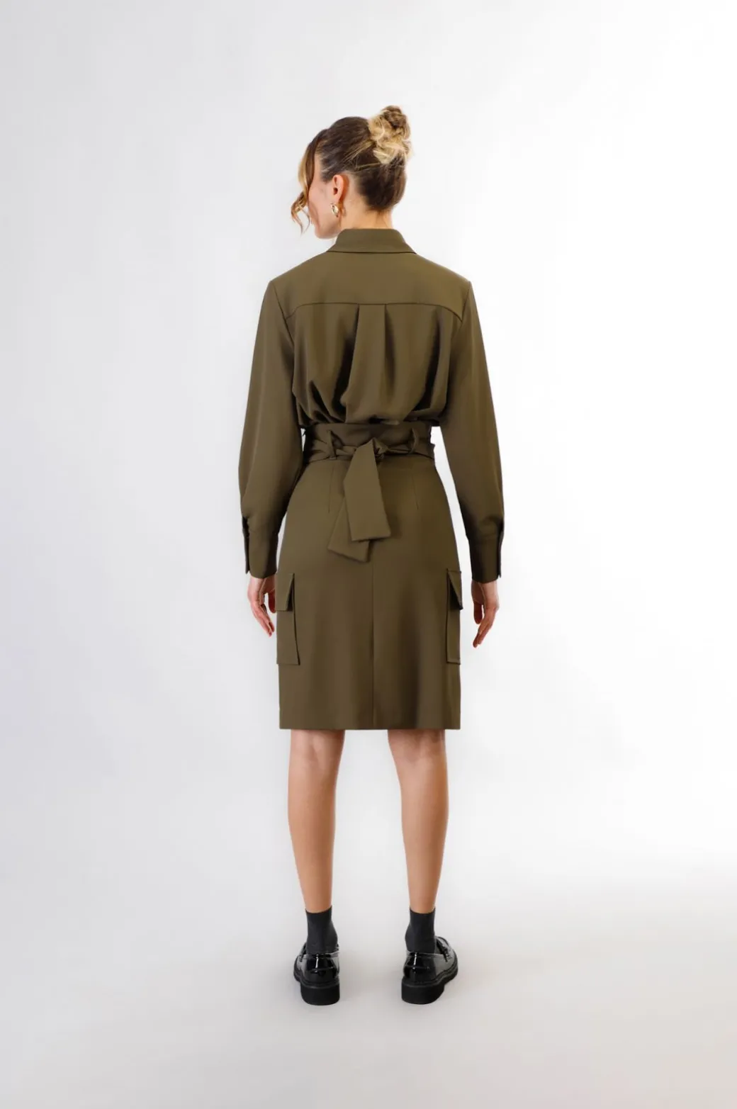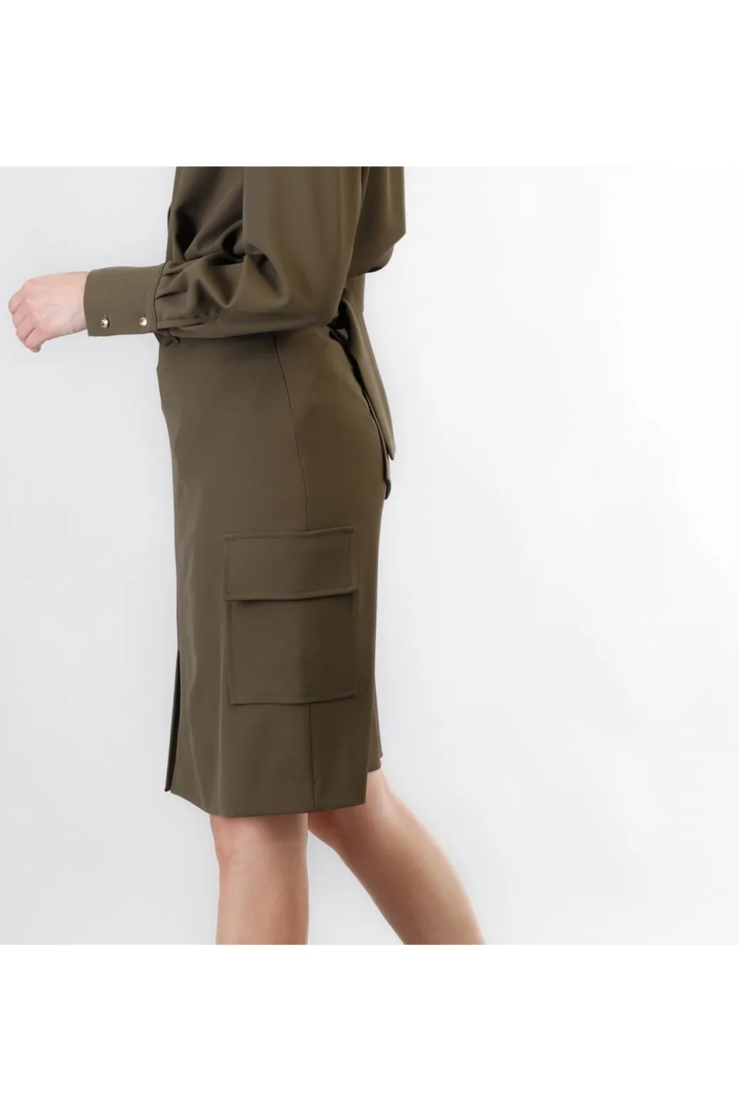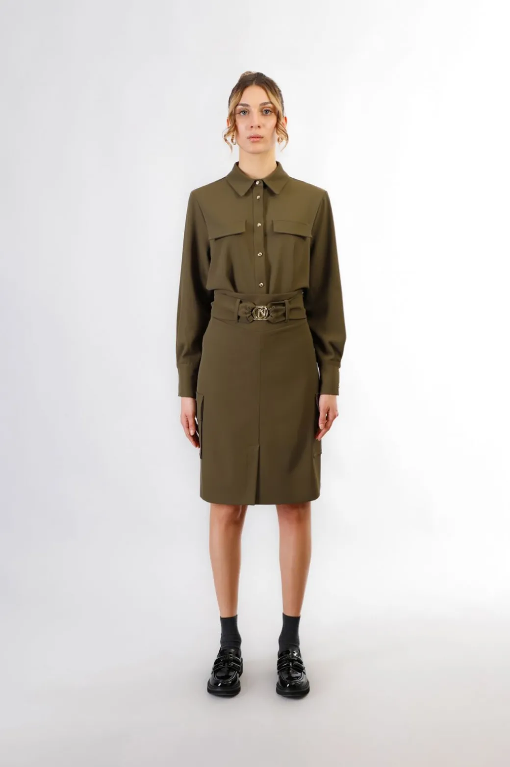 Gonna a vita alta con tasconi laterali tipo cargo realizzato in tessuto fluido. gonnadotata di una fusciacca in tessuto da annodare con fibbia logata. lunghezza sopra al ginocchio e spacco davanti.