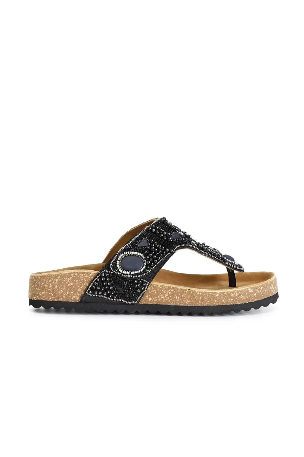 Infradito modello ciabatta con fondo in sughero e fascia regolabile decorata da strass degradè. un incrocio fra lo stile boho e etnico per un’estate all’insegna dello stile