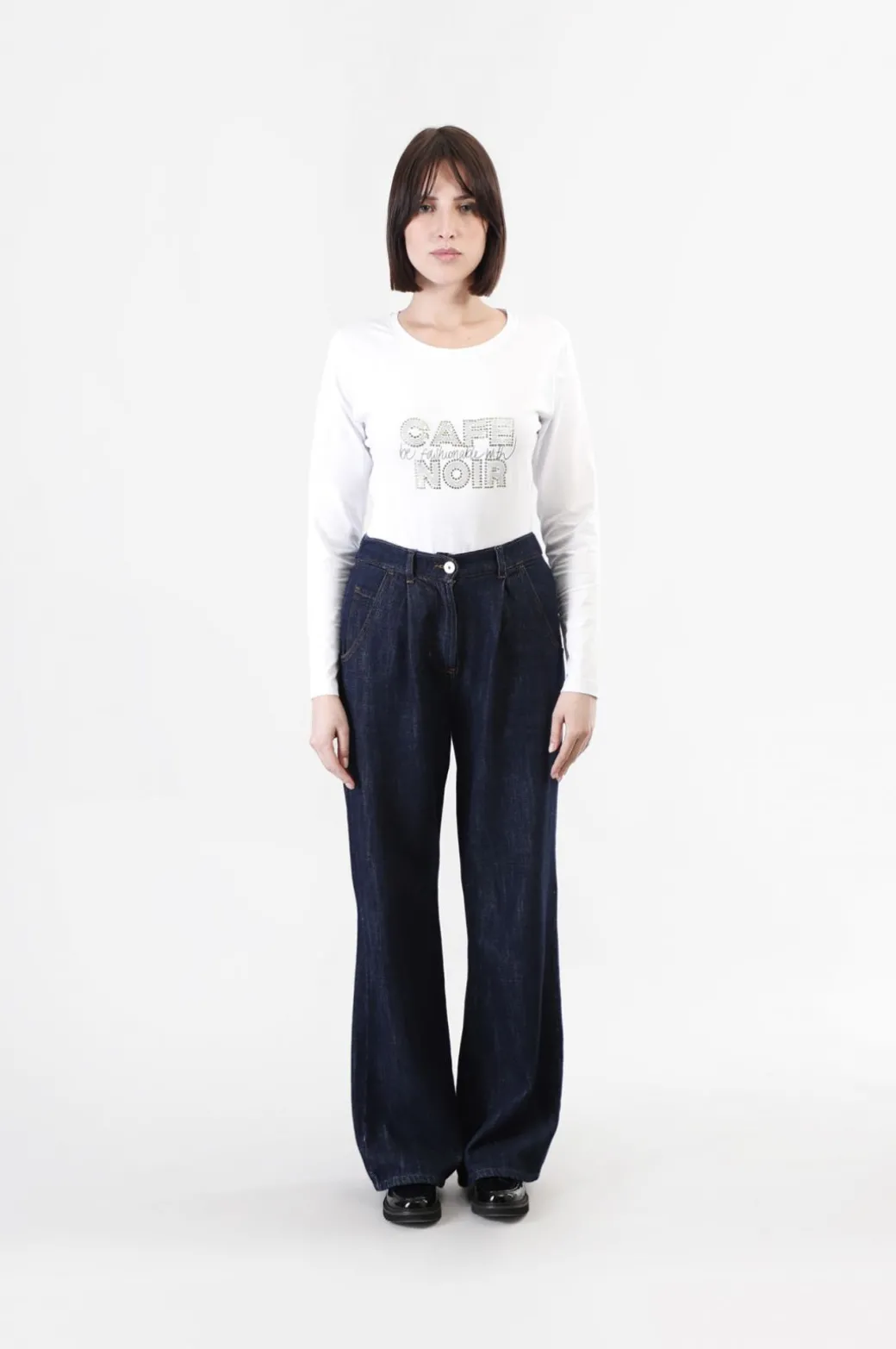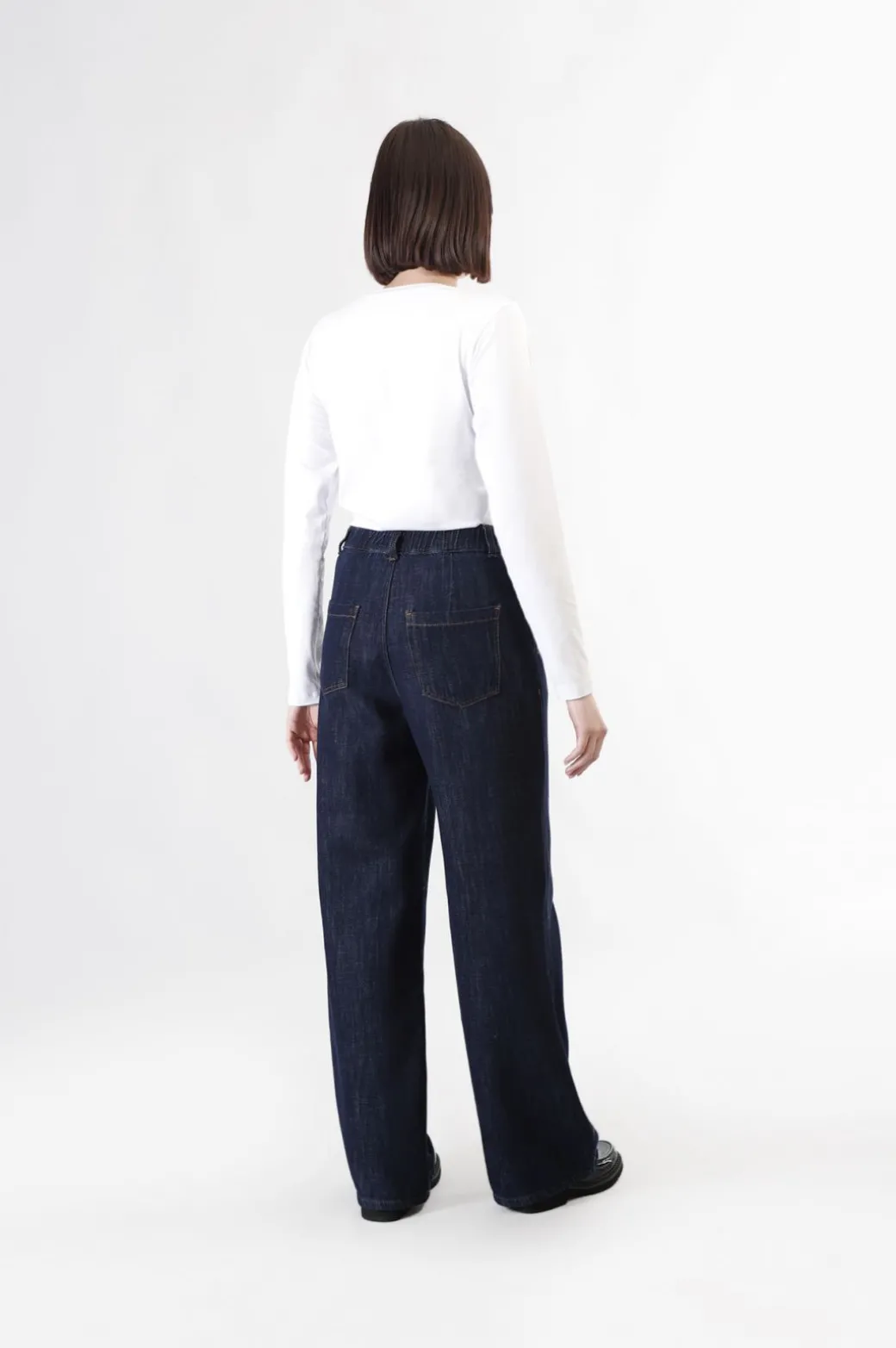 Jeans dalla vestibilità super wide con vita posteriore elasticata. capo realizzato in una tela denim ferma morbida e fluida. jeans che accompagna i tuoi movimenti morbidamente con una linea ampia perfetta come base per creare il tuo stile casual.