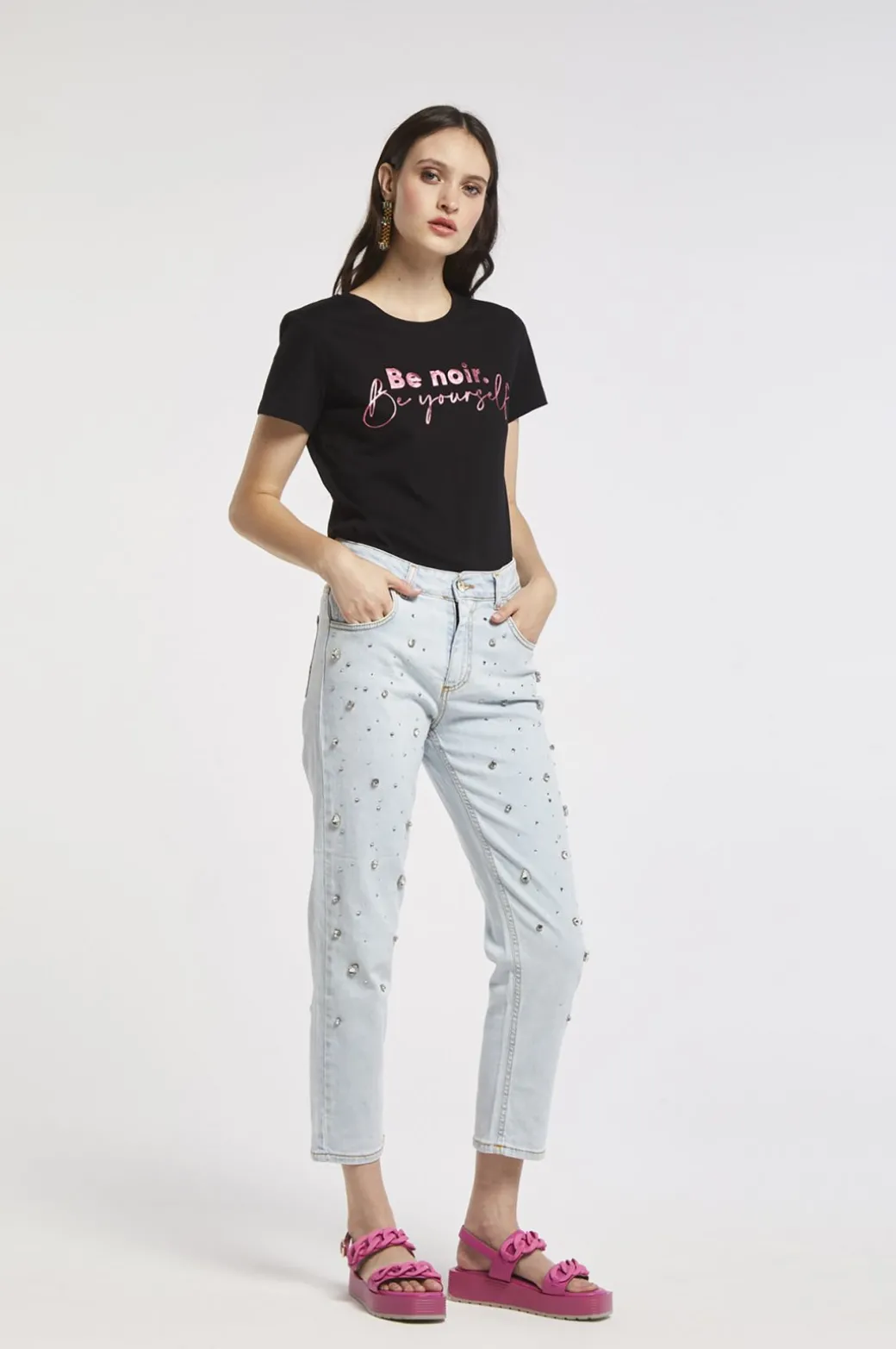 Jeans regular realizzato in una tela comfort. applicazione di preziosi strass sul davanti