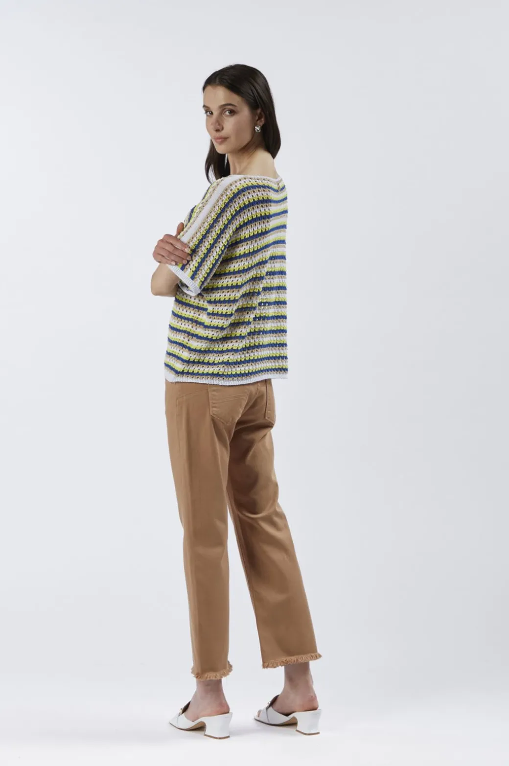 Maglioncino multicolor con scollo a barca e maniche corte. maglia in filato misto cotone con lavorazione crochet. perfetto capo basic per un look anni ’70. da abbinare ad un paio di jeans flare o ad una maxy gonna.