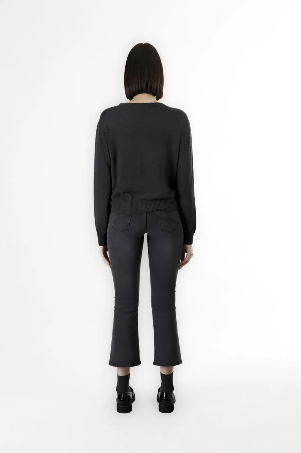 Maglia in caldo e morbido filato mistolana. punto maglia rasato e lavorazione jacquard per il nostro slogan “be noir” impreziosito da strass sapientemente applicati. disponibile in una variante bicolor molto di tendenza e di due varianti colore in tinta unita.