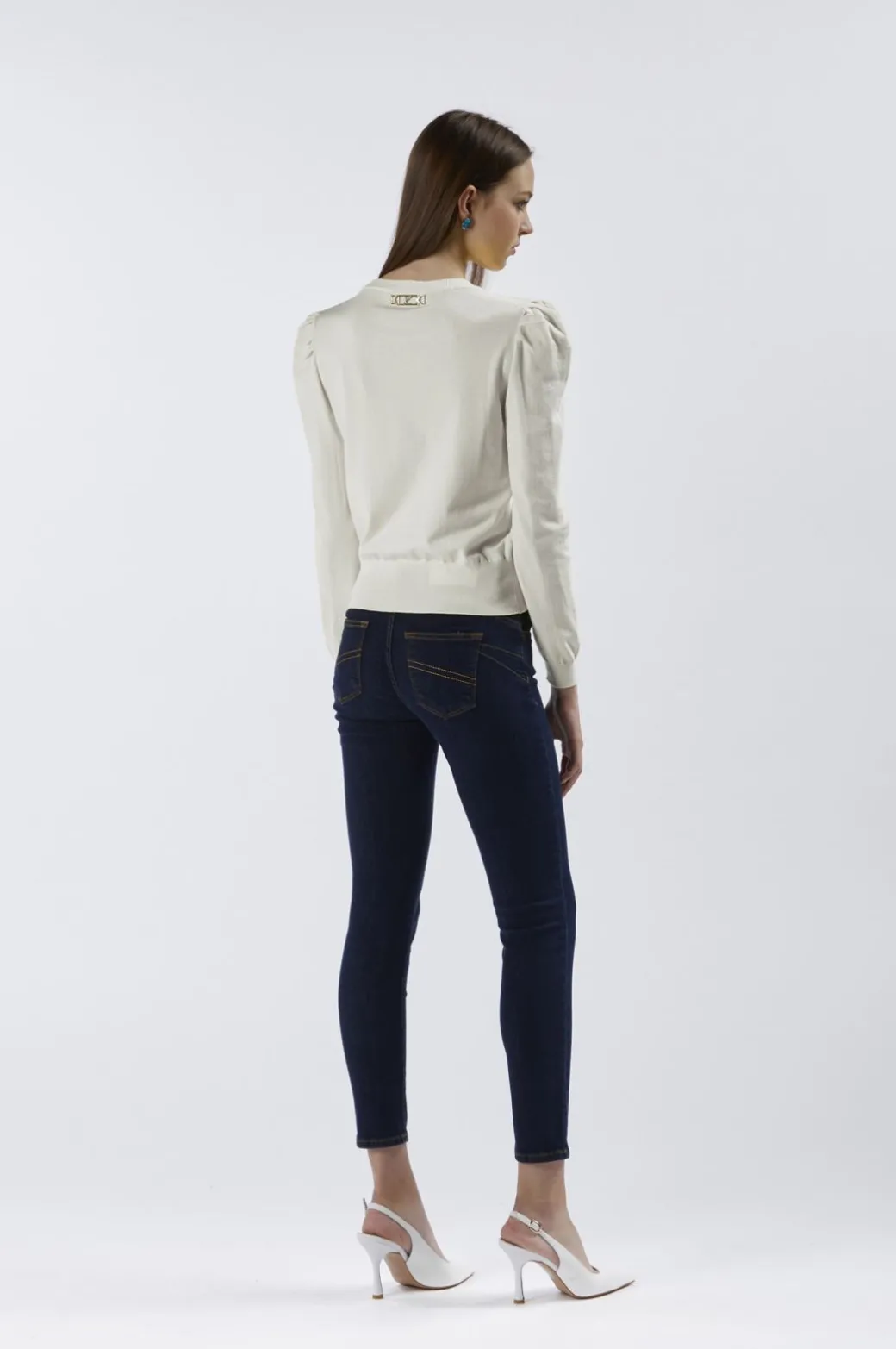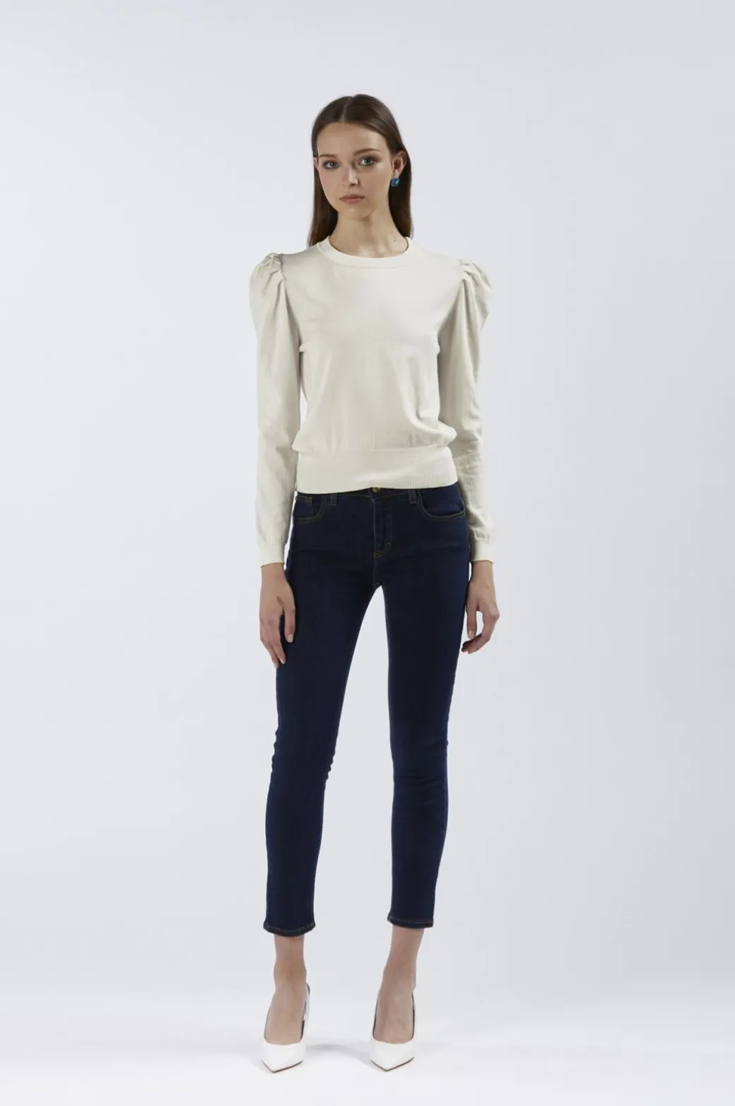 Maglia basica girocollo a maniche lunghe con increspatura alle spalle. realizzata in filato misto viscosa.