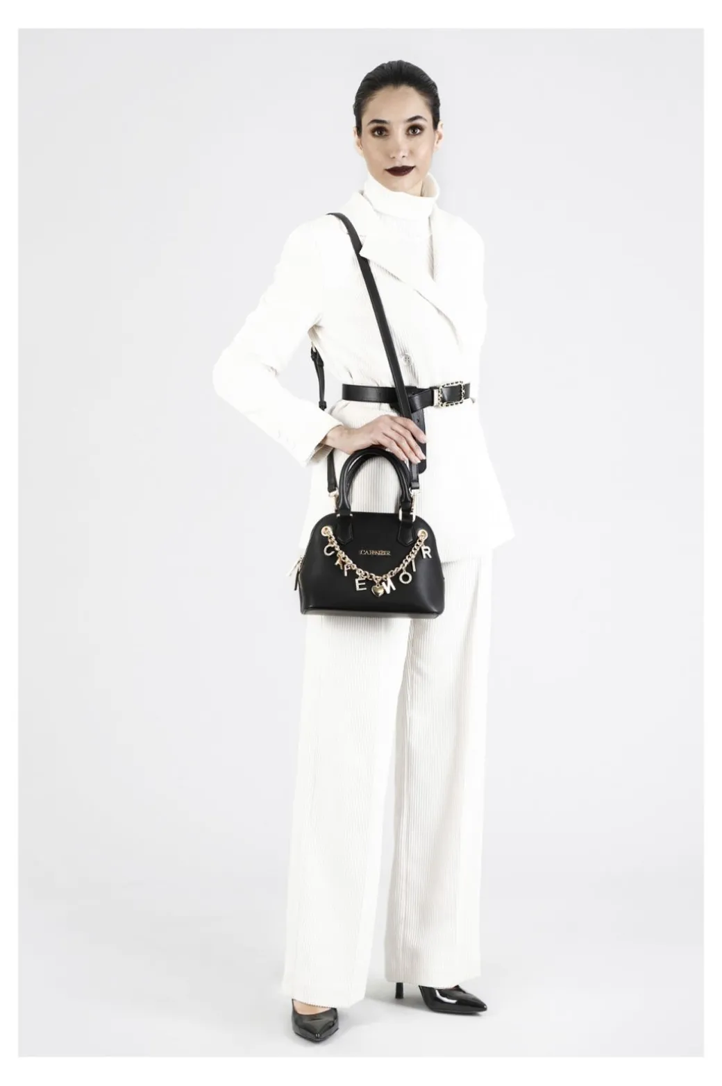 Mini bag da portare a mano oppure a tracolla, impreziosita da una catena con lettere pendenti Cafènoir ricoperte di strass.
