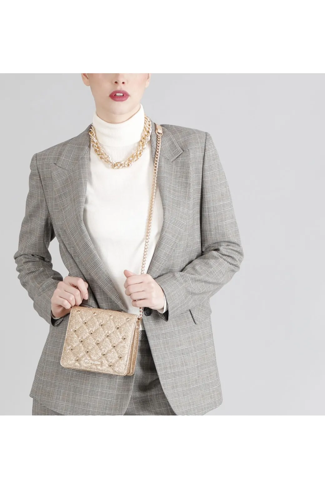 Mini bag glitterata con borchie esagonali. tracolla con catena. doppio scomparto e taschino interno. chiusura a calamita.