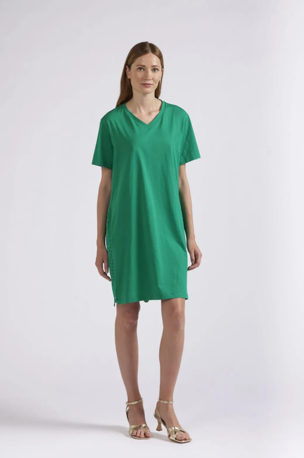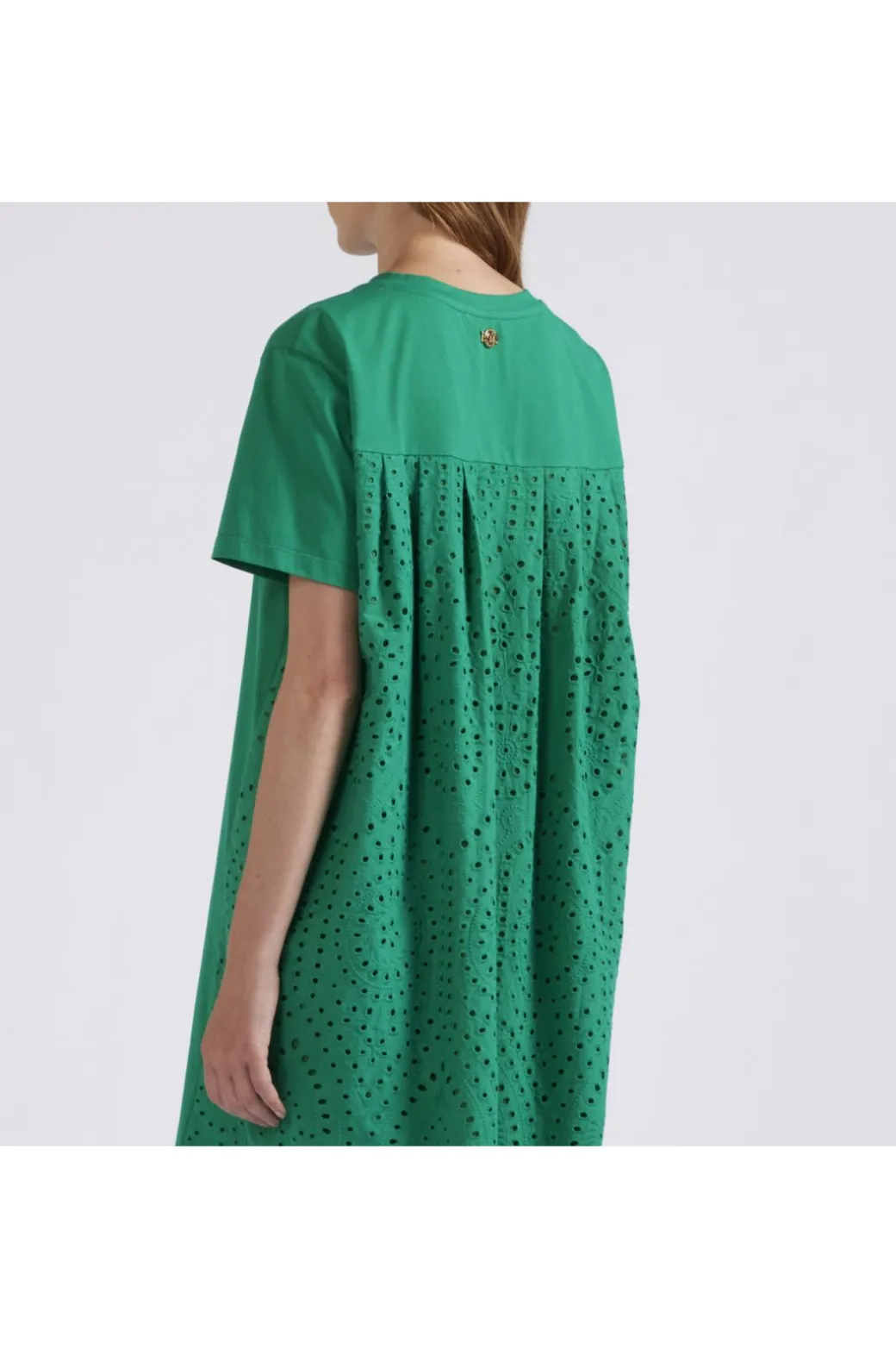 Miniabito bimateriale con il davanti in jersey di cotone e il retro in sangallo. scollatura a “v” e maniche corte. vestibilità comoda.