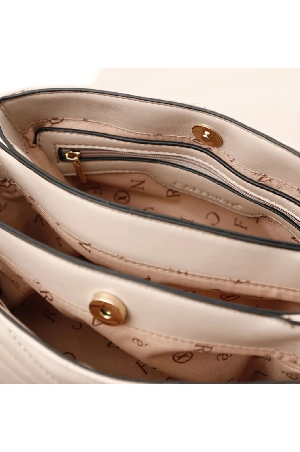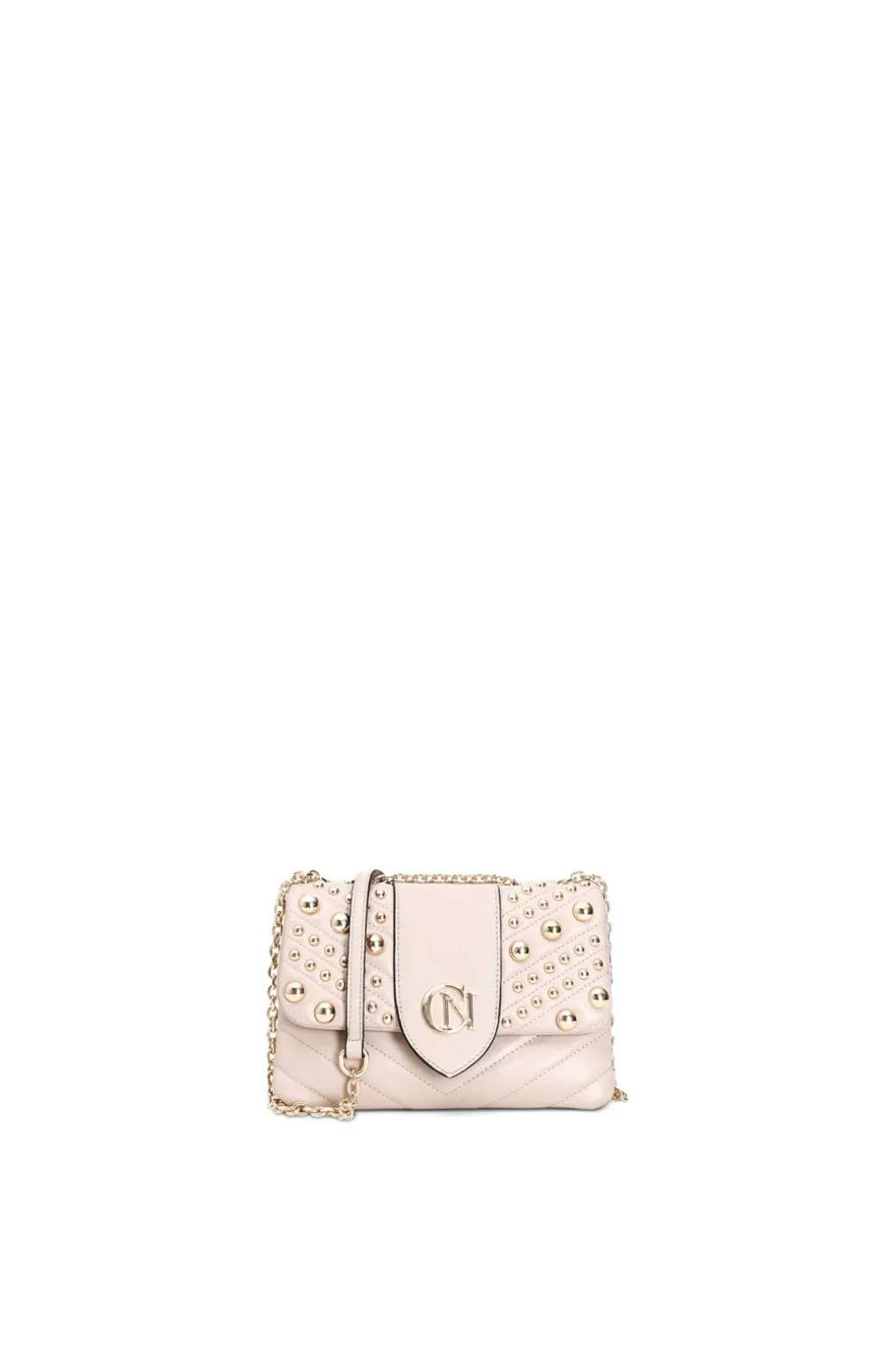 Minibag con pattina trapuntata tempestata da file di borchie semisferiche di diverse dimensioni e accessorio CafèNoir metallico sul davanti