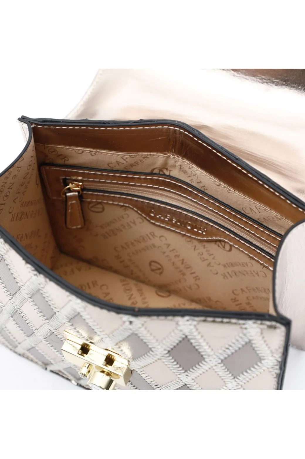 Minibag rigida dai colori metallizzati. patchwork di rombi. unico scomparto e taschino interno con zip. chiusura a scatto con accessorio in strass. borsa dotata di tracolla.