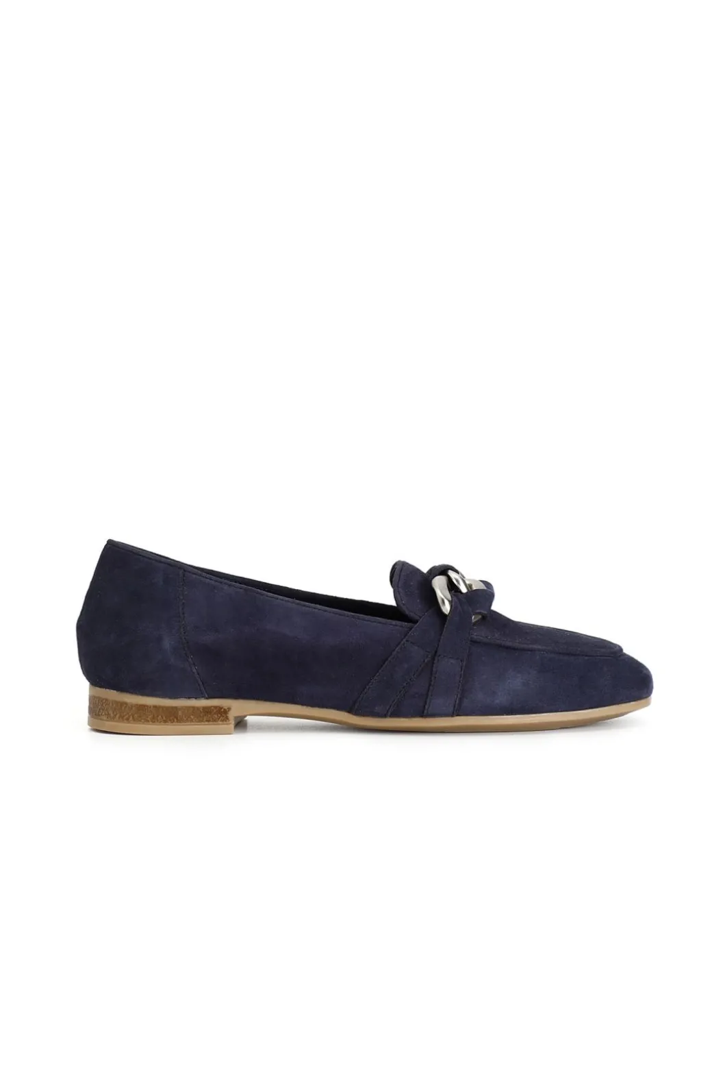 Mocassini donna in pelle scamosciata arricchiti da un morsetto a catena. il soletto è in pelle. tacco alto 15mm. modello versatile e dinamico ideale per completare moltissimi outfit.