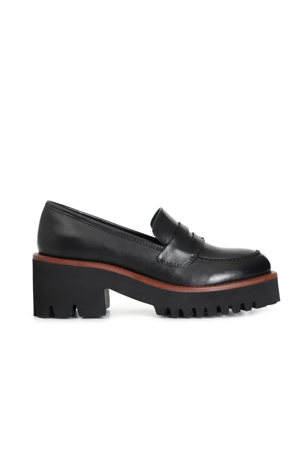 Mocassino da donna in pelle con suola nera e guardolo colorato. suola a carro armato alto 60 mm e plateau di 30 mm. la fodera e il soletto sono in pelle.