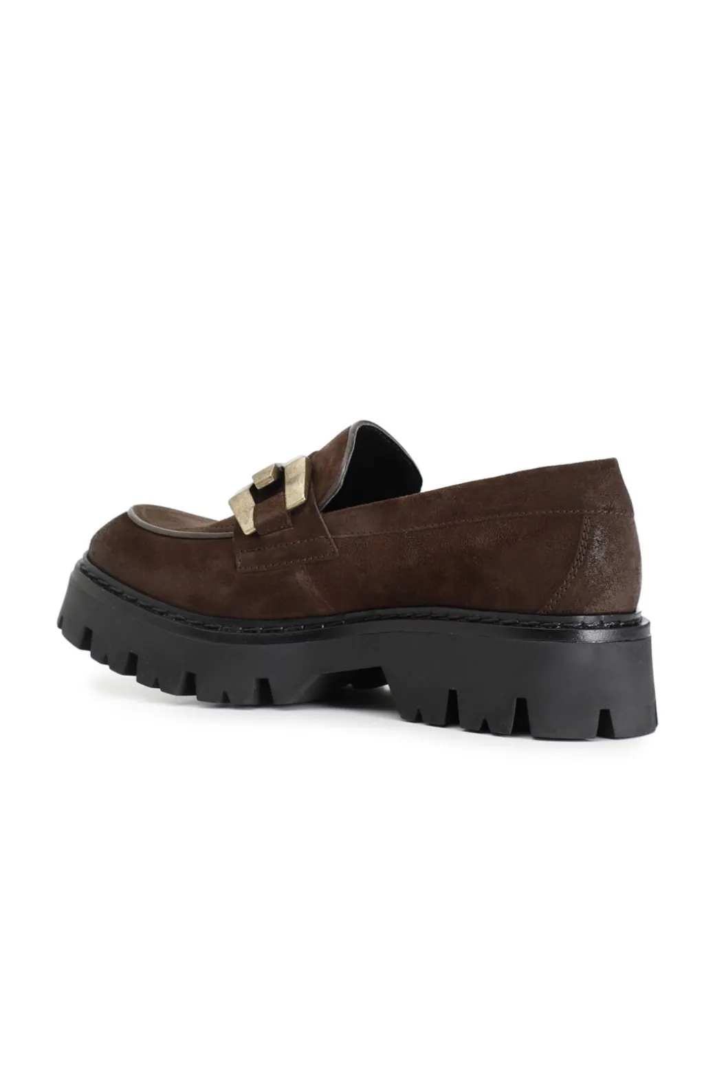 Mocassino da donna in pelle scamosciata arricchita da un particolare morsetto sul passante. il soletto è in pelle. modello versatile e dinamico ideale per completare moltissimi outfit.