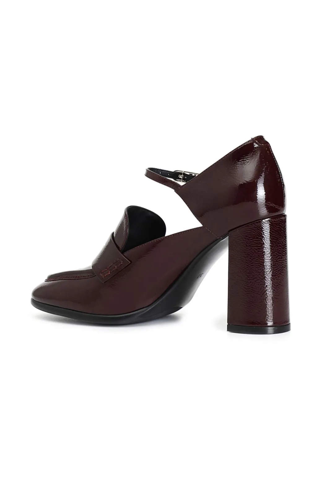 Mocassino da donna in pelle verniciata con cinturino e fibbia personalizzata. tacco squadrato 88 mm. il soletto è in pelle. calzatura molto versatile e chic per interpretare con stile i look da ufficio e per il tempo libero.