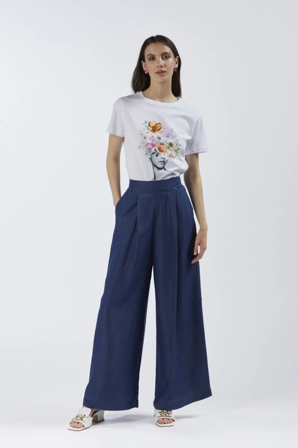 Pantaloni lunghi e ampi con pieghe davanti. realizzati in tencel jeans. tasche laterali. cinturino elastico nella parte posteriore per aumentarne la comodità.
