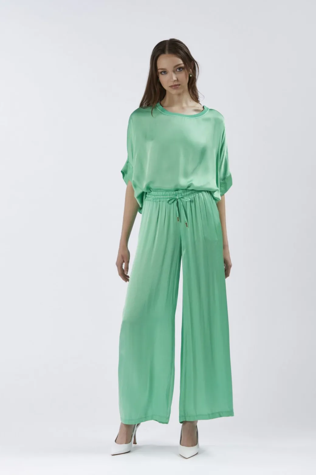 Pantaloni ampi tipo palazzo con vita elasticata realizzati in satin di viscosa. comodi e pratici per un look casual impeccabile.