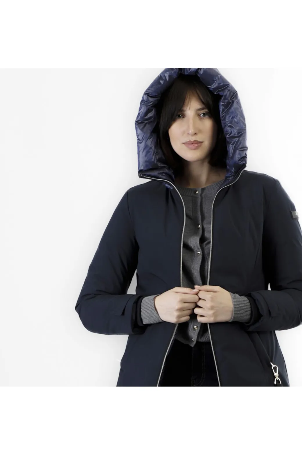 Piumino con cappuccio fisso in tessuto a contrasto realizzato in tessuto soft shell. modello avvitato dal look femminile. chiusura con zip doppio cursore. da indossare per andare al lavoro quando il maltempo si fa sentire per una passeggiata all’aria aperta con la famiglia o le amiche.