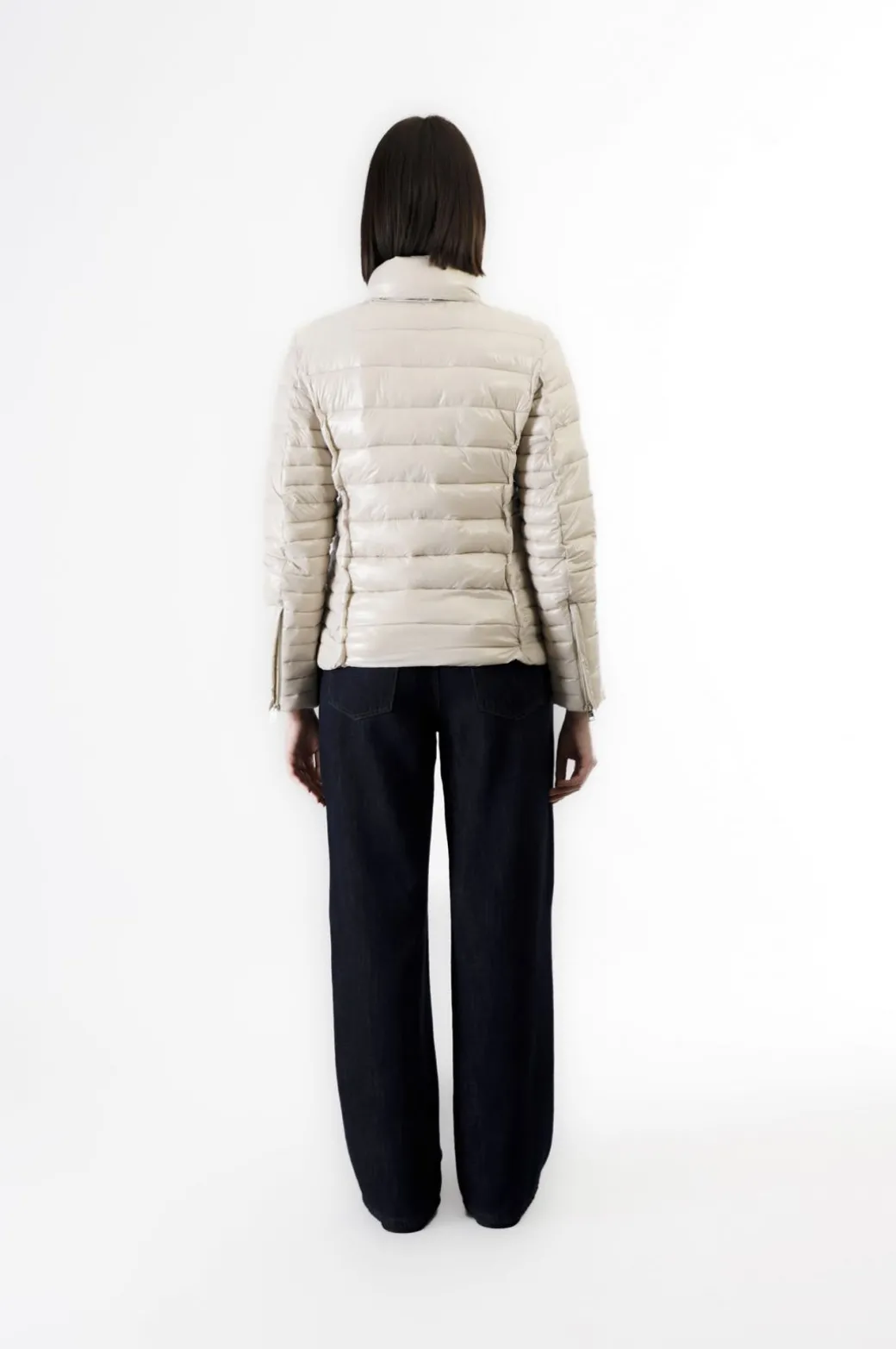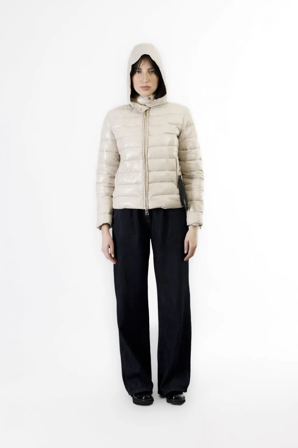 Piumino corto dalla forma essenziale realizzato in nylon ultralight dalla finitura lucida. il capo presenta un cappuccio di emergenza nascosto all’interno del colletto. versatile e pratico capo immancabile nel guardaroba della nuova stagione autunno inverno.