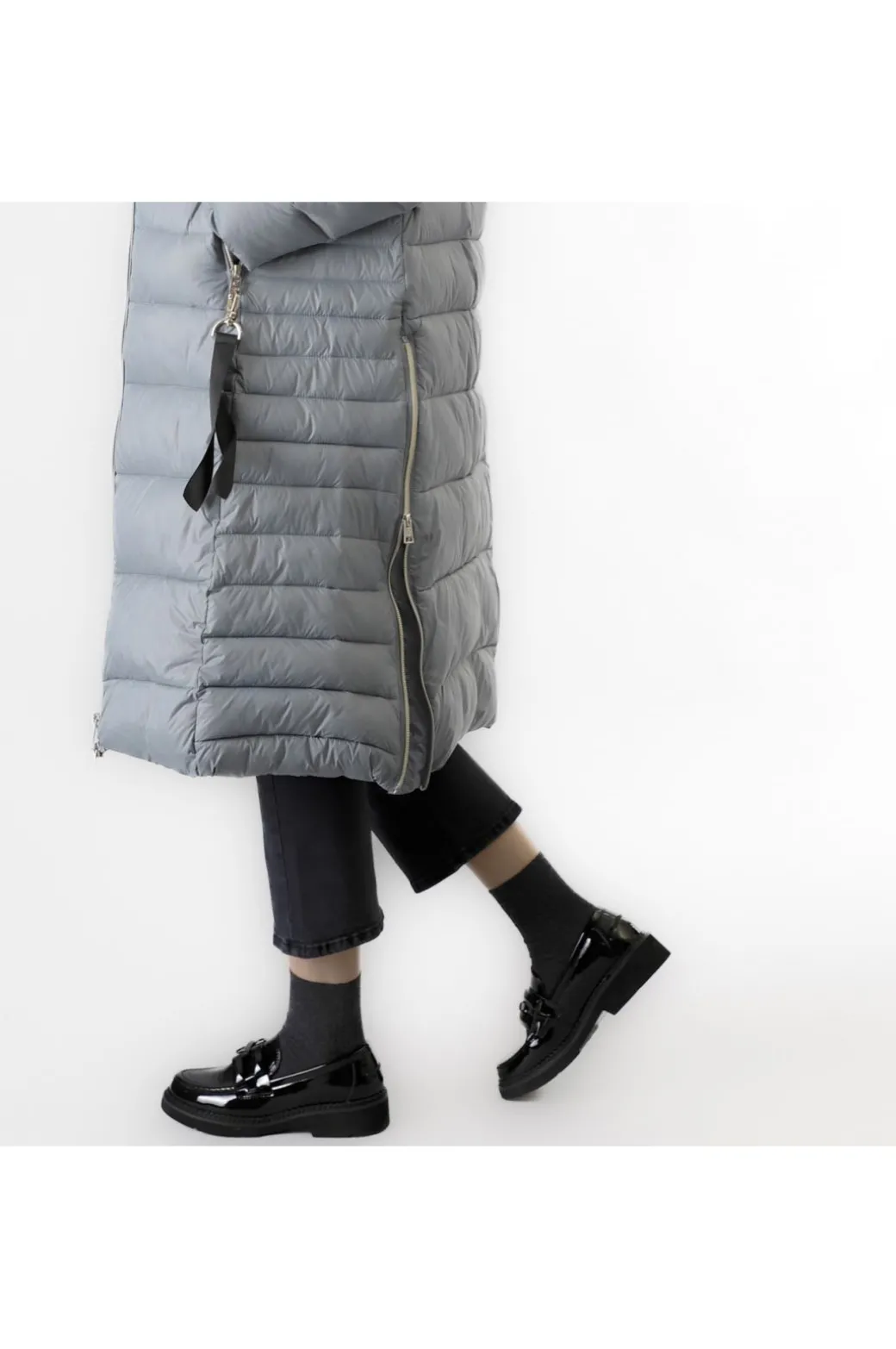 Piumino lungo con collo avvolgente realizzato in nylon ultraligth. colletto avvolgente e caldo. chiusura con zip doppio cursore. zip sul fianco per agevolare i movimenti. capo classico e versatile perfetto per le fredde giornate invernali.