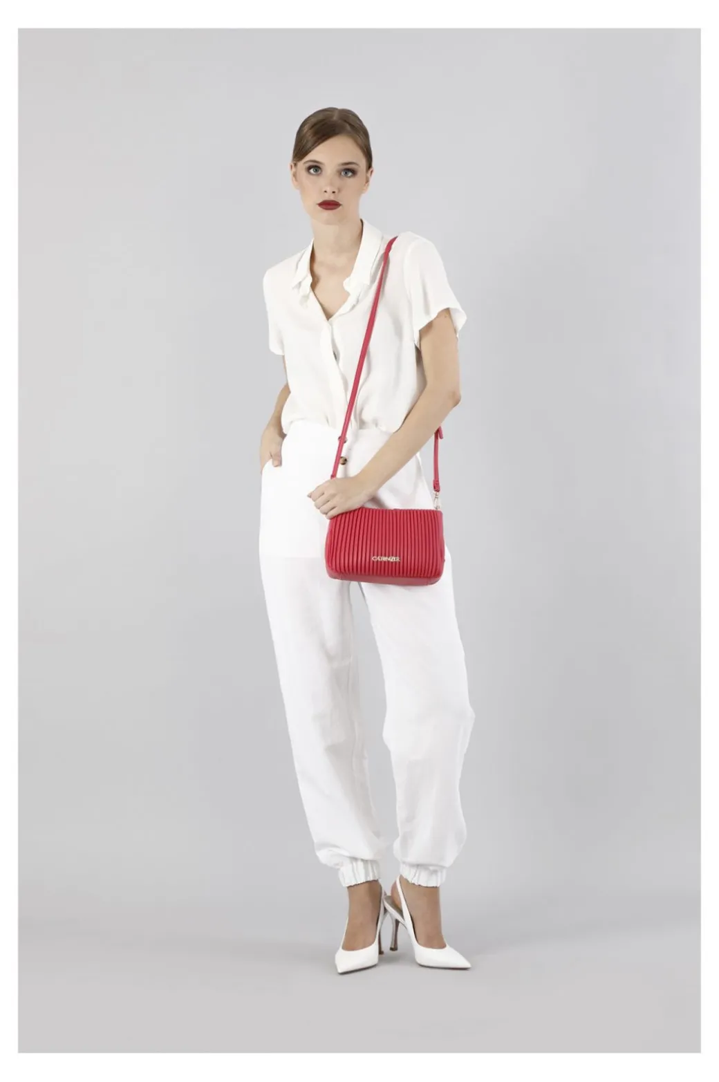 Pochette con lavorazione plissé. chiusura con cerniera. unico scomparto interno con taschino con cerniera. tracolla regolabile.