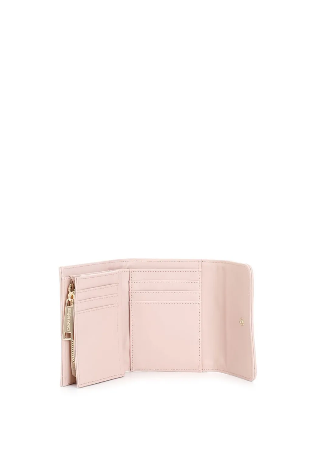 portafoglio con pattina con applicazone di rivetti colorati e logo bicolore cipria