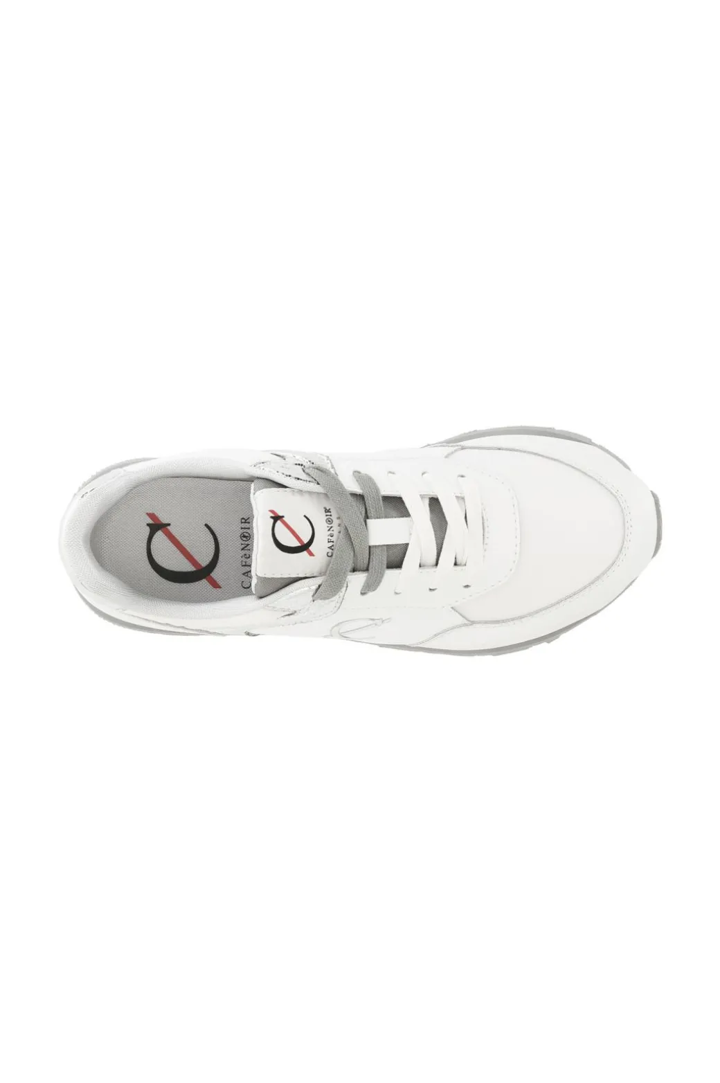Sneakers da donna con suola running allacciate. calzatura in pelle rivestita e tessuto con riporti effetto shimmer. logo argentato laterale con monogramma cafènoir. altezza suola 30 mm. fussbett interno.