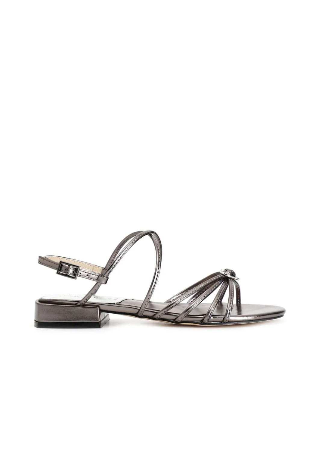 Sandali con multilistini con effetto laminato caratterizzato da un doppio incrocio. accessorio frontale a forma di cuore. comodo soletto imbottito per una calzata morbida. tacco alto 20mm. comodi da indossare e facili da abbinare.
