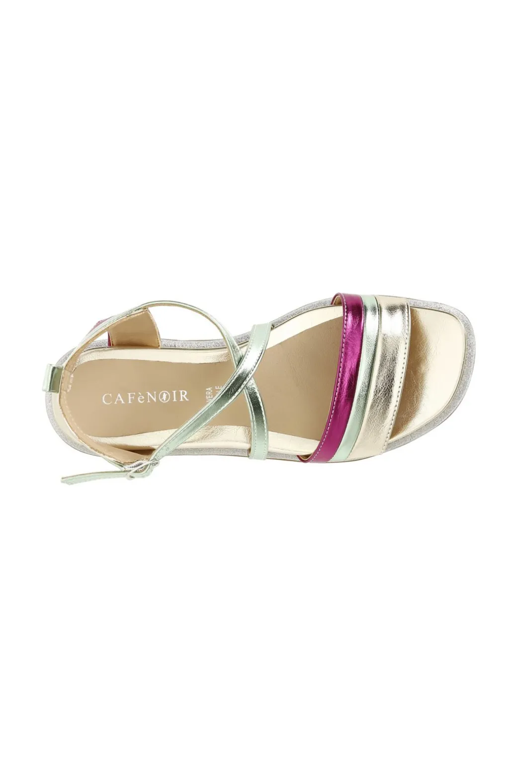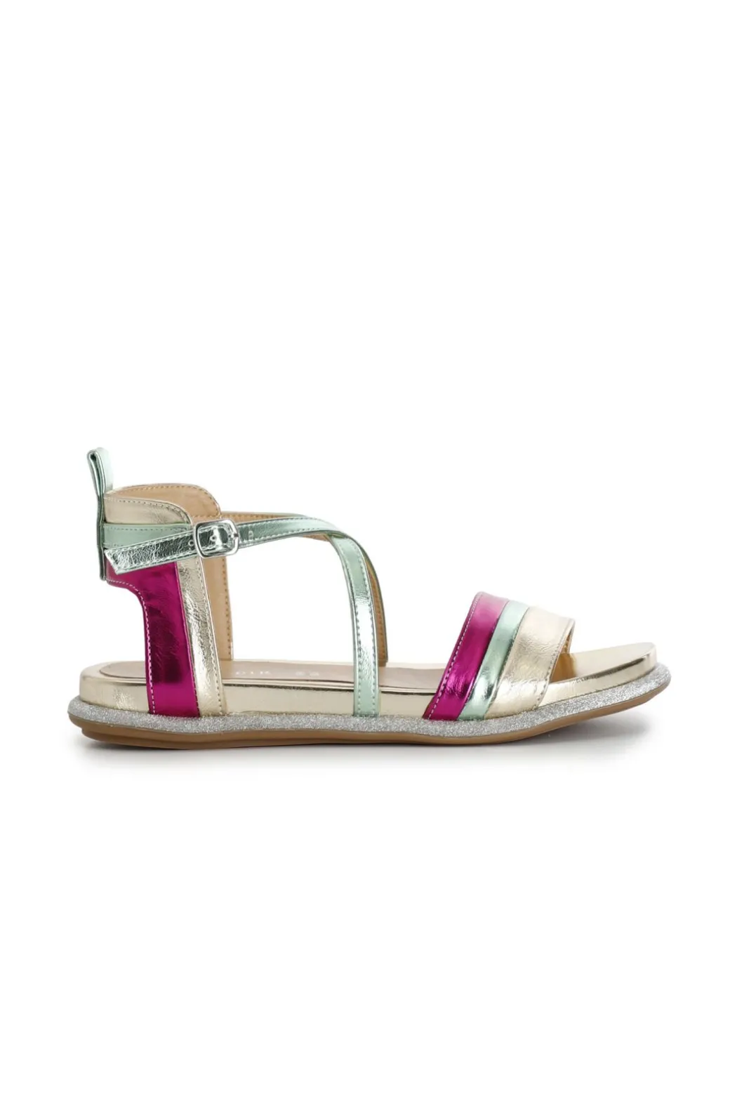 Sandali bassi in similpelle laminata multicolor dai toni pastello. il tallone è scoperto ma sorretto allo stesso tempo da una cornice laterale in similpelle. cinturino alla caviglia.