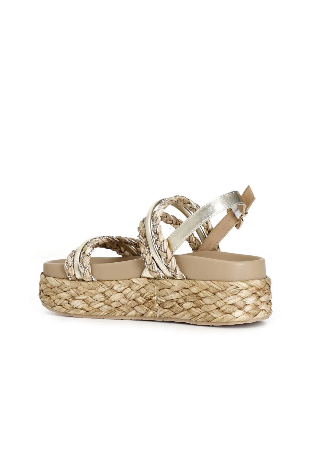 Sandali frate color block in raffia intrecciata con inserto strass. comodo footbed e la zeppa è fasciata in raffia.